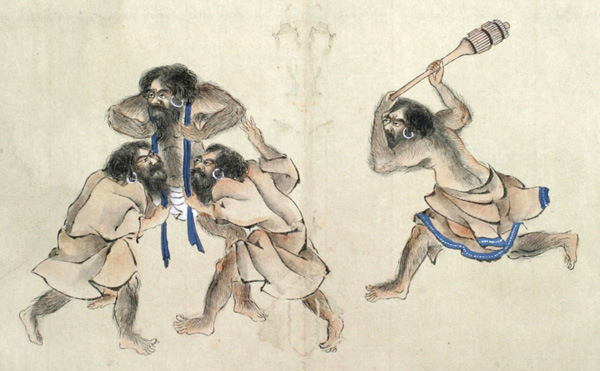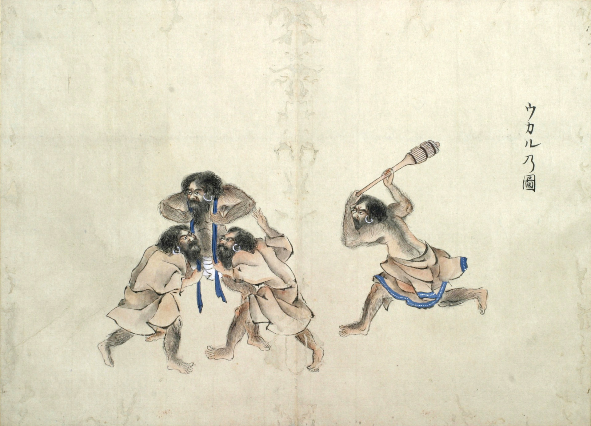 是といふも幼少より平生の遊ひにもウカルの眞似に打合などし、成長なしても右のならしに常々打合をするなり。 尤平生は素はだにてはなく、アツシの上に獣の皮にて草(わら)などを包み、是を背に負て打合ふ。 ケ様に平日ならし置(く)ゆへ、格別に體疲れぬ事と見へたり。
