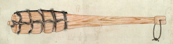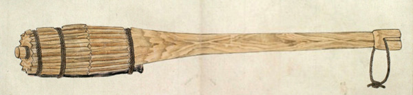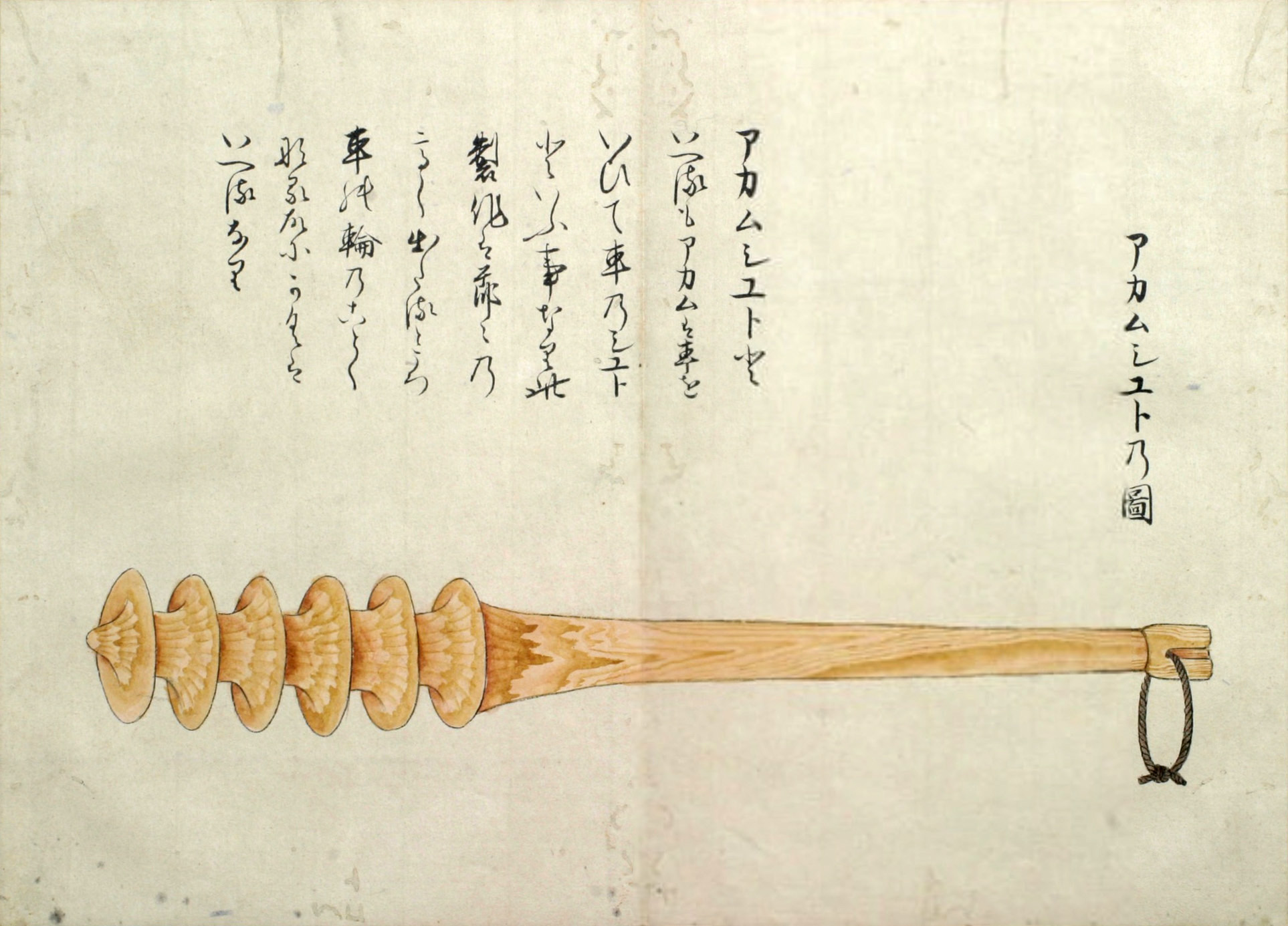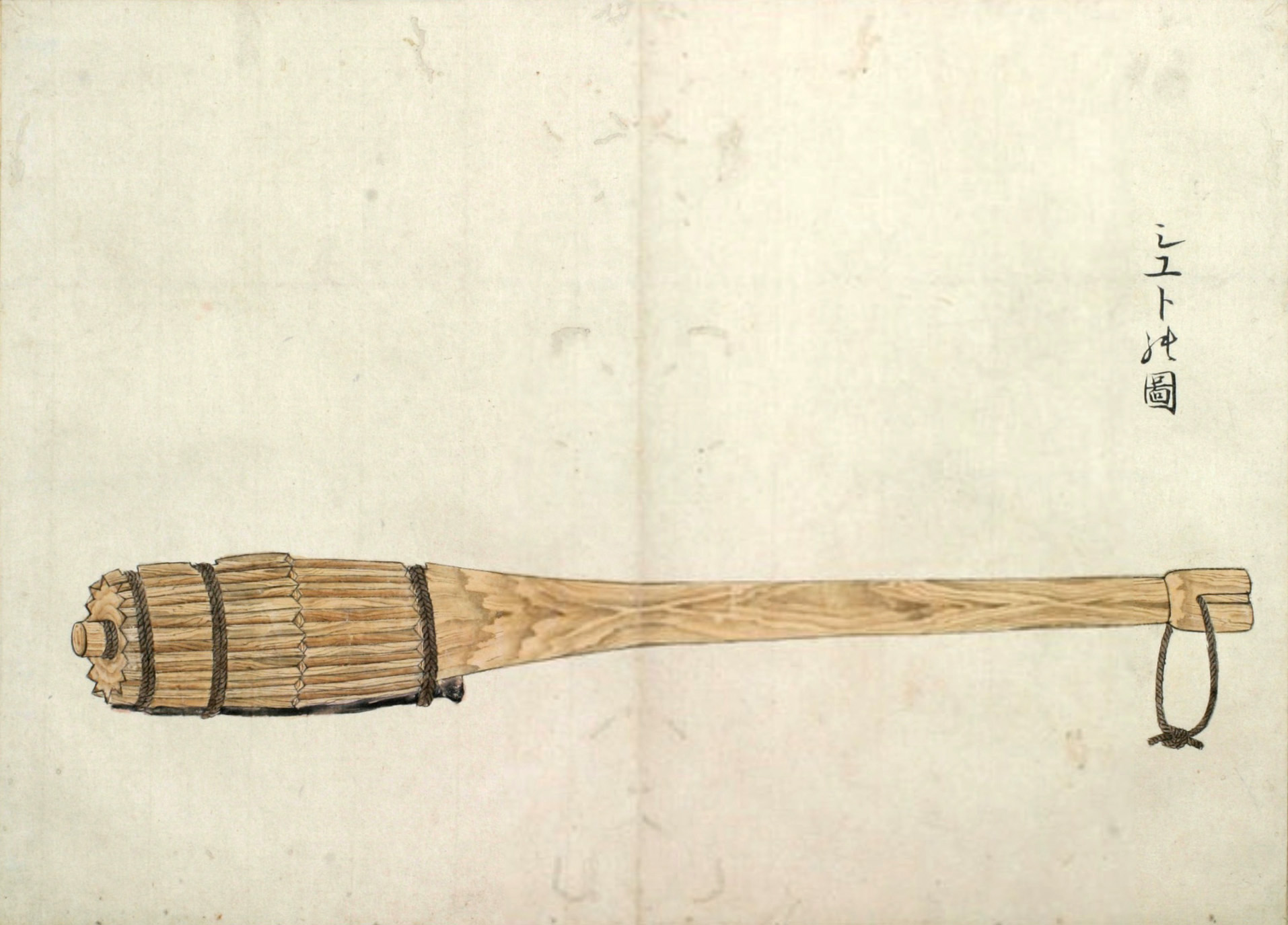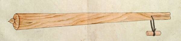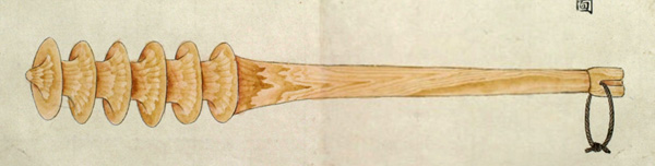 ウカルといふは、長さ三尺程なる圖のごとくのシツ゚ 和名ツチなり といふ物、樫の木にて作り、先の太さ丸差渡し三寸位、太き所の長(さ)八寸程にて、筋は珠盤(そろばん)の玉の角のことくになし、重みに銕鉛をいれ、横の二筋は一段ひくく、鐵の輪をいれたるなり。