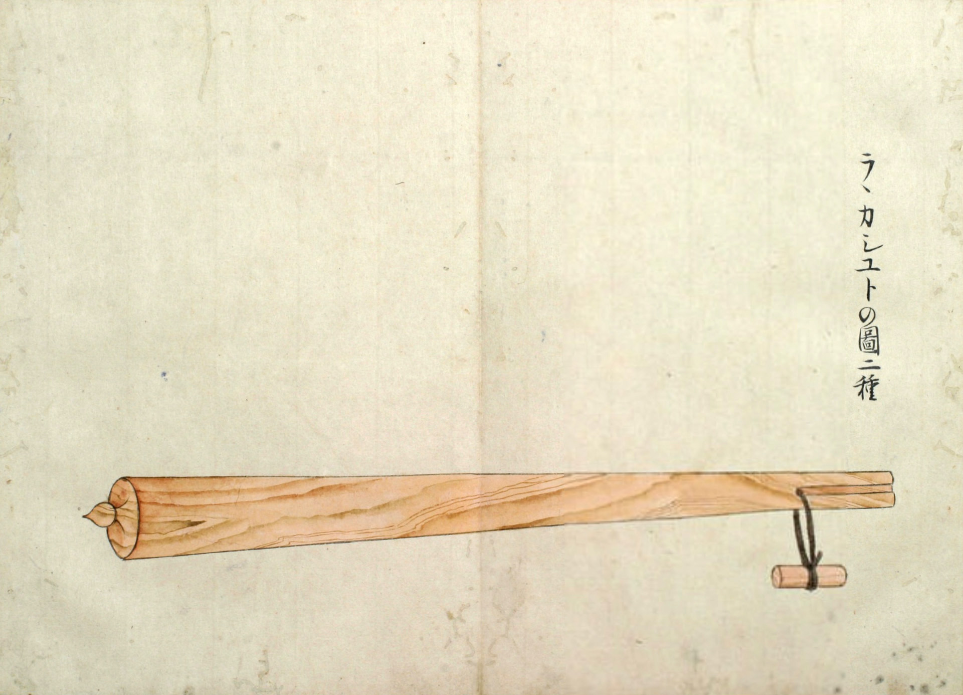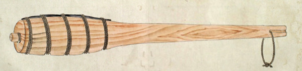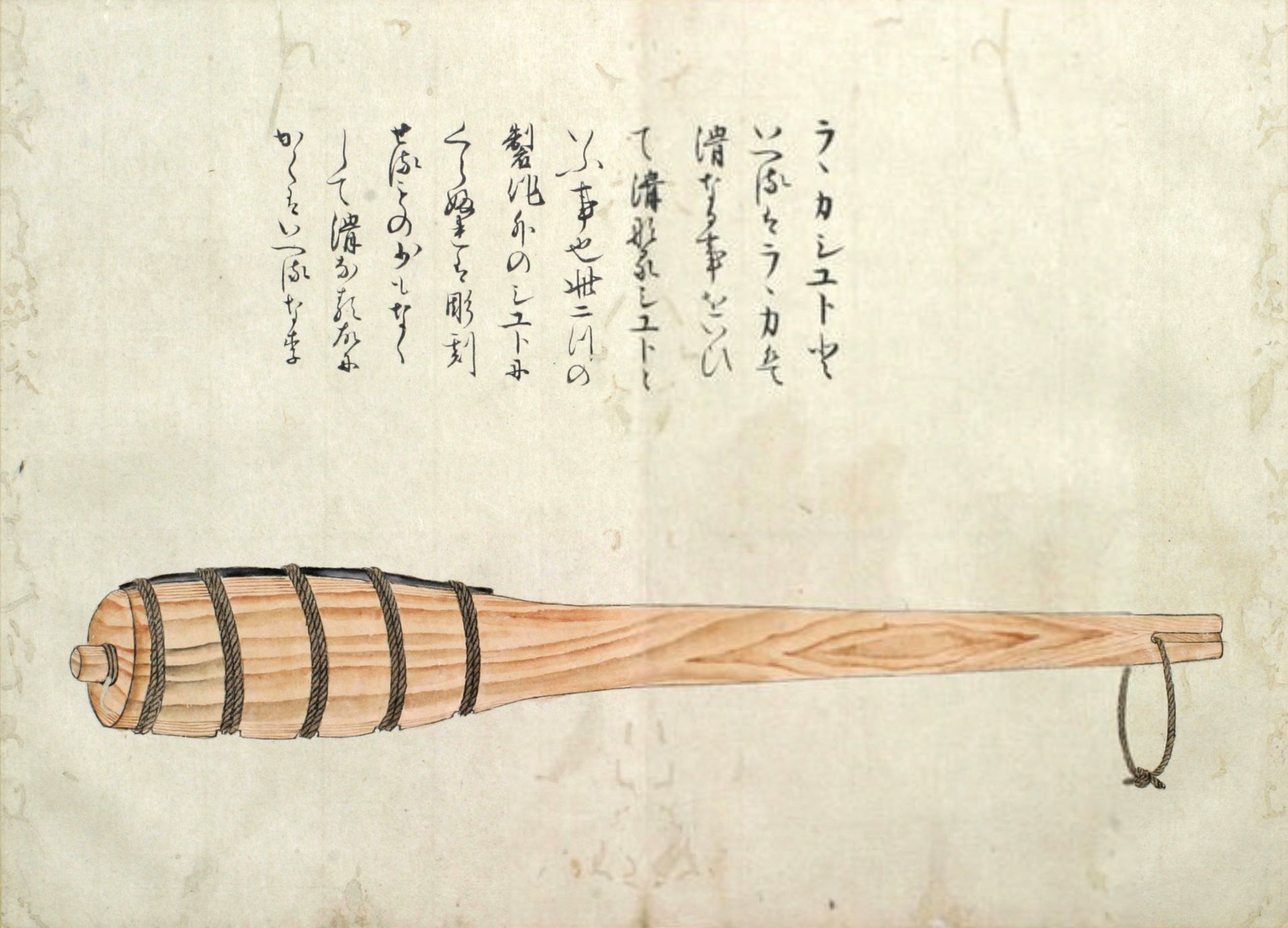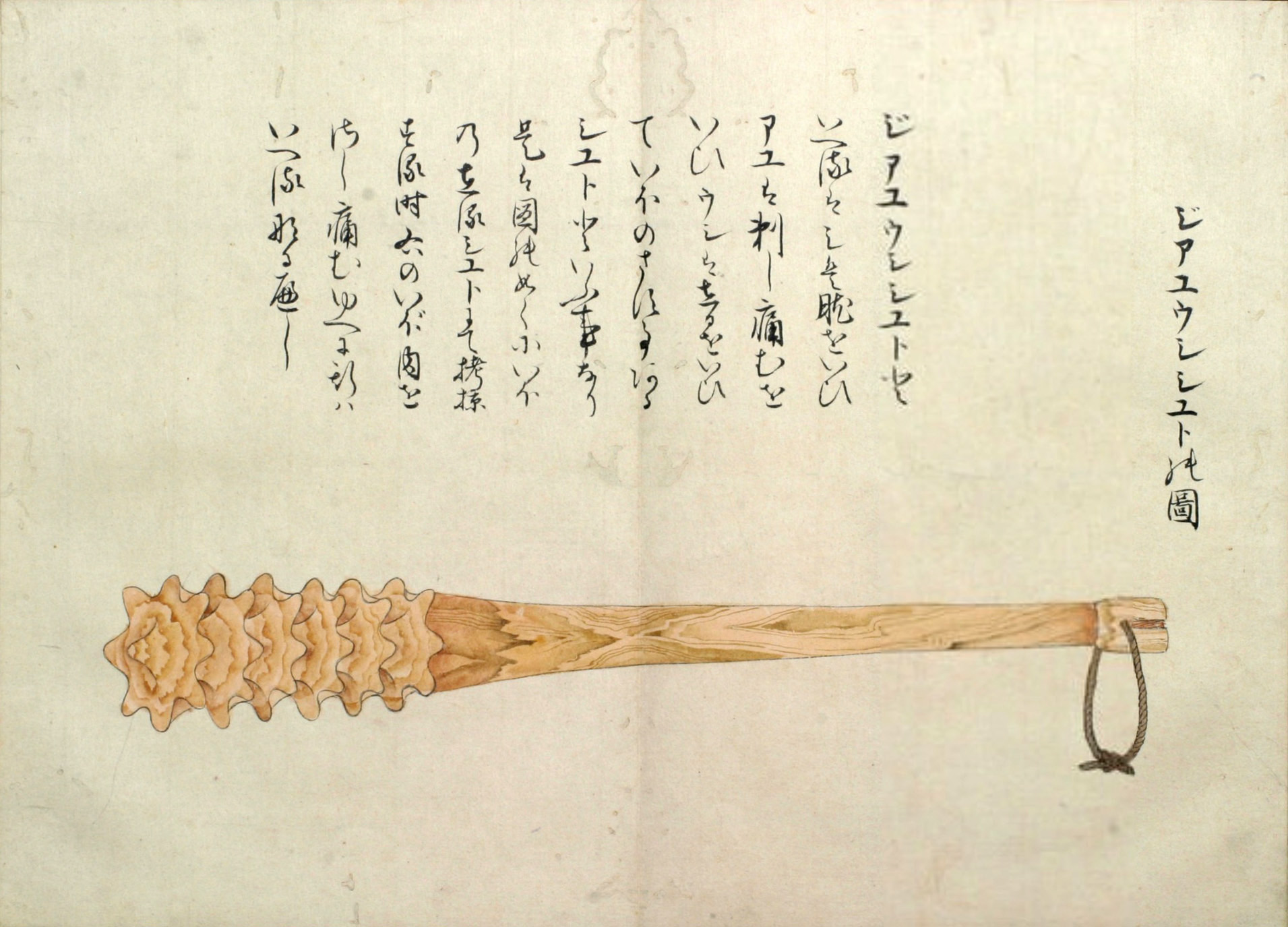 ウカルといふは、長さ三尺程なる圖のごとくのシツ゚ 和名ツチなり といふ物、樫の木にて作り、先の太さ丸差渡し三寸位、太き所の長(さ)八寸程にて、筋は珠盤(そろばん)の玉の角のことくになし、重みに銕鉛をいれ、横の二筋は一段ひくく、鐵の輪をいれたるなり。