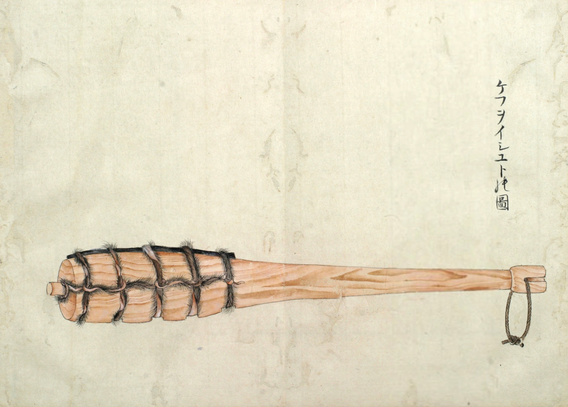 又おなしさませし短き槌子(つち)に,木絲巾(アツシ)の布をひた巻にまきたるが榻床(セッカ)の下に投棄たるは,わかきアヰノらがつねのいとまあれは,槌搥(セトフ)のわざをならはせるの具となん。