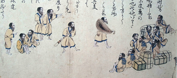 大船の事ゆへ、少人数にてはおろす事成がたく、是に依て蝦夷人を手傳に頼度段、重寶丸船頭會所へ願たる故聞届、其日は手透の折からにて、蝦夷人大勢貸し遣しけるが、臺おろしも無滞濟、其祝義として、手傳に出たる夷どもへ船より酒を振舞たりしか、其酒機けんにまかせ、夷どもの内より申出しけるは、