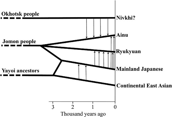 そのあいだに、北方から渡来したオホーツク人とも遺伝子交流があり、さらに近世以降は本土日本人との遺伝子交流が活発になり、現在にいたっている。