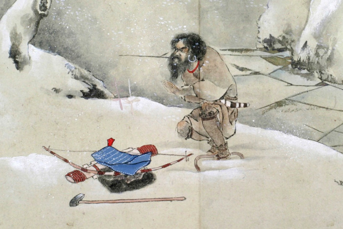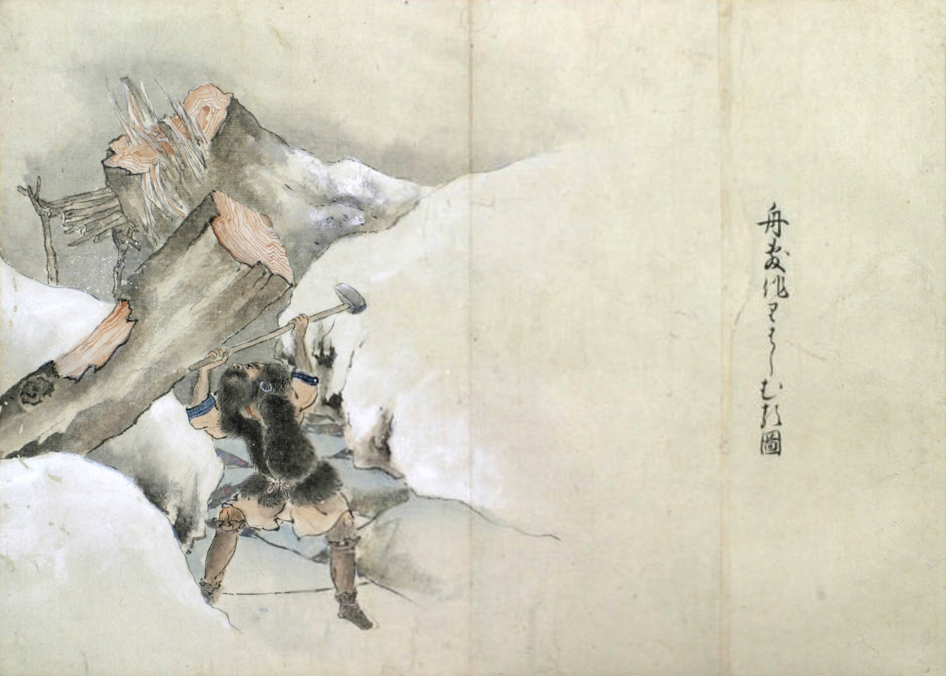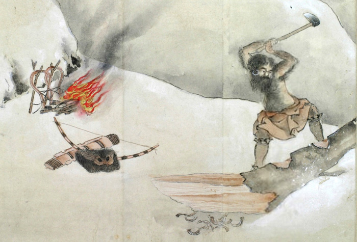 舟敷となすべき木を尋ね山に入んとして山神を祭る圖