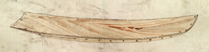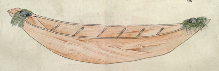 川用の丸木舟[チプ] は一本の丸太を削り込んで作られ、一艚作るのに二人で五日もあればできるが、長さが25フィート[7.5メートル]あるこの舟を調べてみると、舟は二つの部分からなり、舳先から艫までずっと非常に強力な樹皮でつながれていて、舟縁も同じようにつなぎ合わせて高くしてあることがわかった。