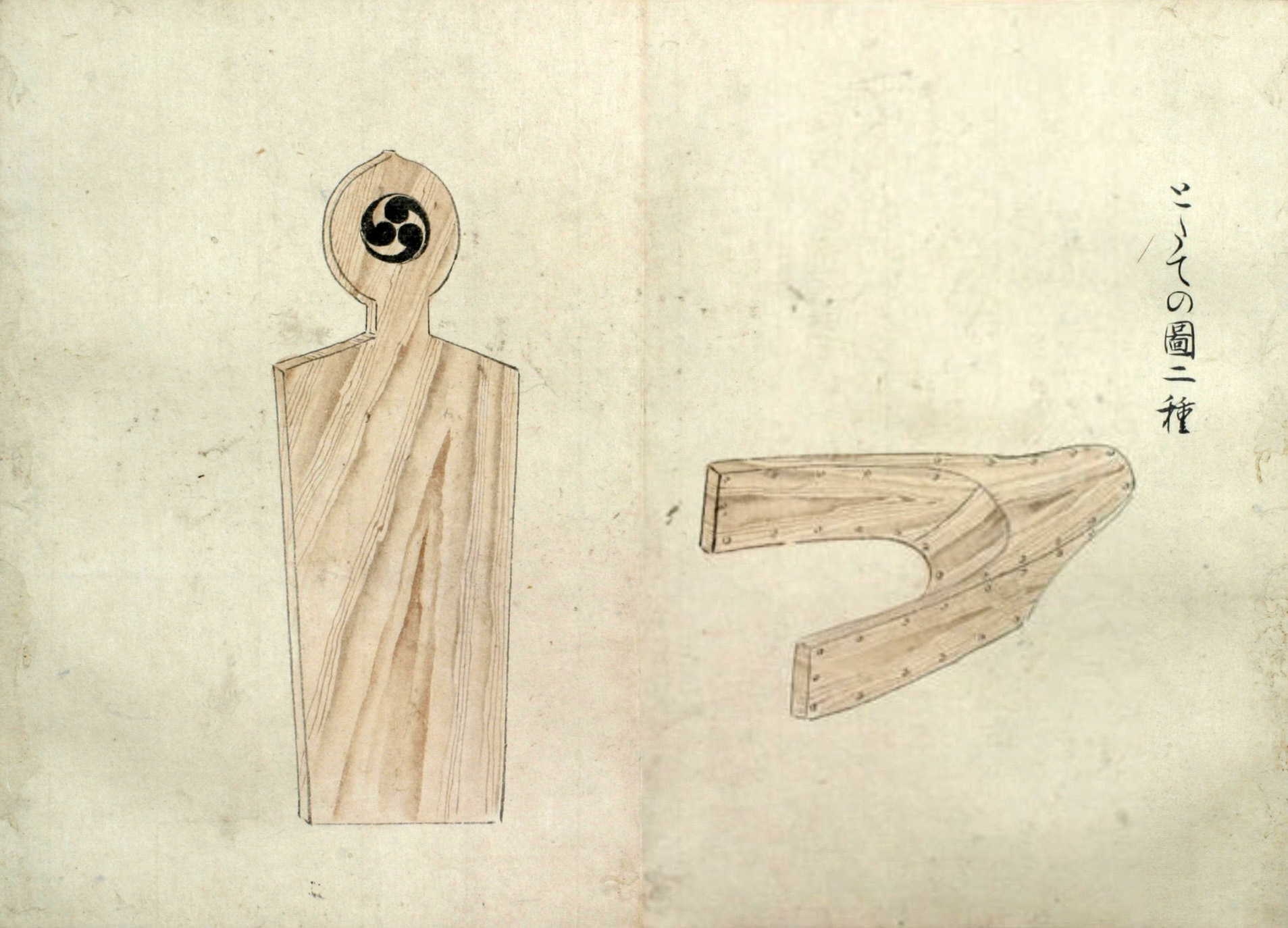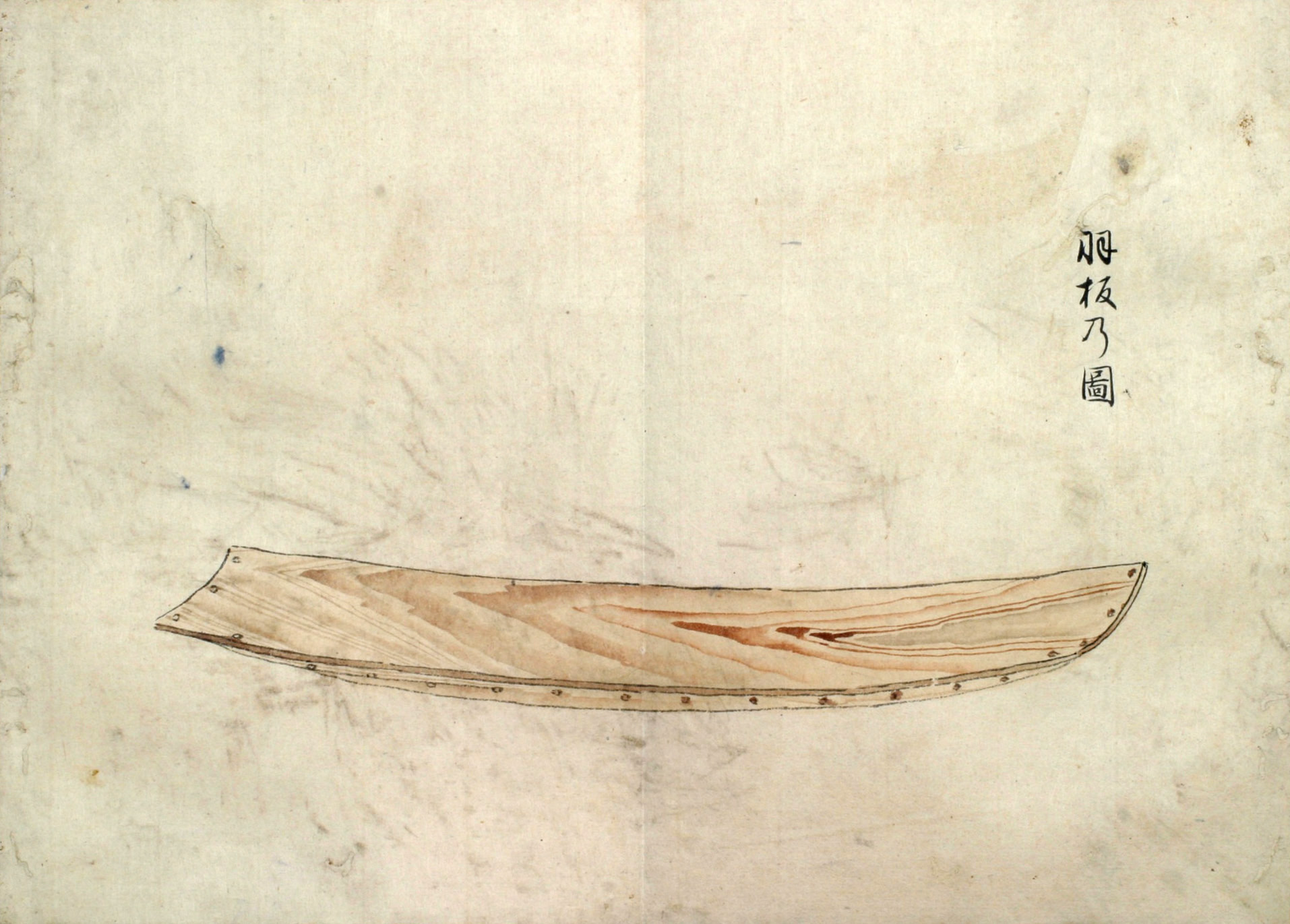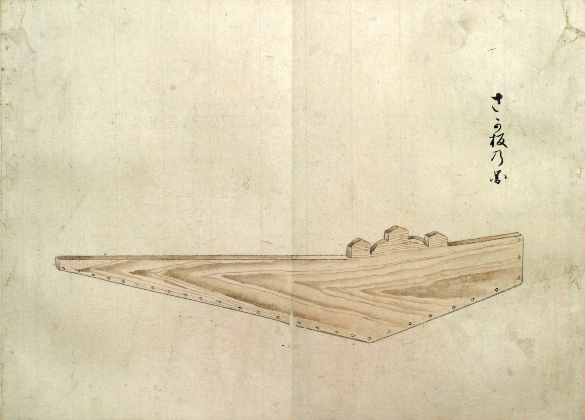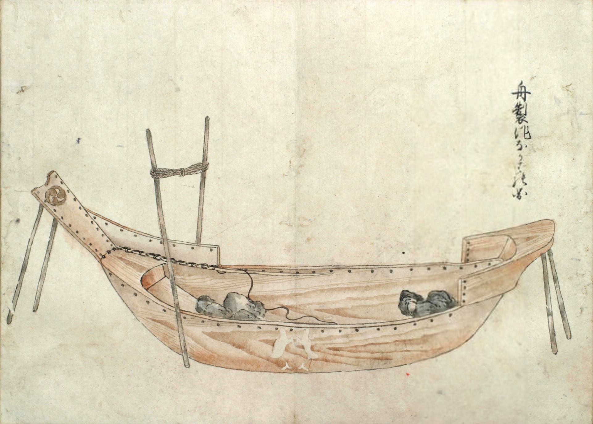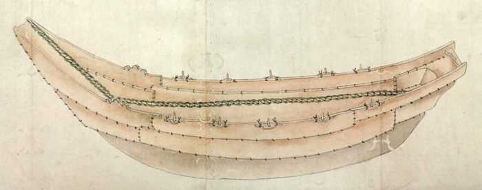 まづ‥‥敷の両縁のうちに横木をいれ、内えしぼまざるよふになし、また舳、艫に莚よふの物を厚く巻き、ひゞの入り損せざるよふにして幾日とい