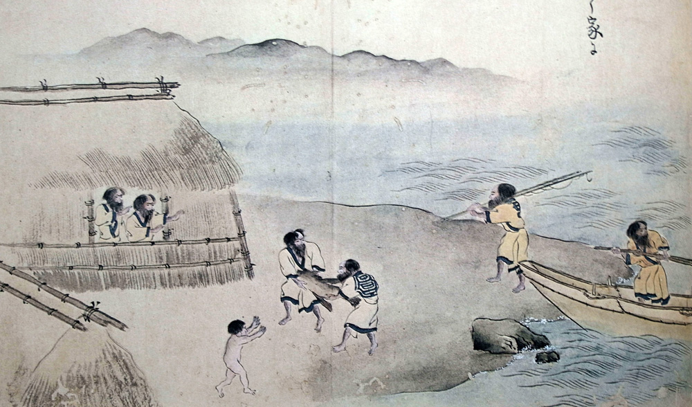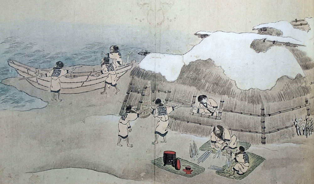 ウネヲは、かんな月の寒さを待得て、冬の(ヘロキ)(にしん)の集(すだ)くをくはんと追ひあさるを、蝦夷舟(チイツフ)こゝら、このコタンより乗出て、突きてんとねらひありけど、