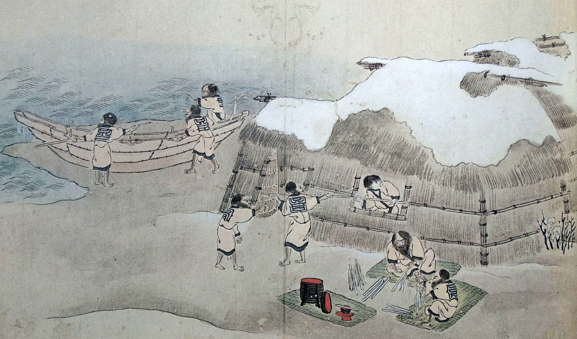 十月(かみなつき)のへロキにあさるウネヲより捕り()め、春の海に突めぐり、夏のはじめ卯月の海となりては、シャモの名に智加(ちか)といひ、アヰノこれをヌラヰといふ魚にあさるを取りて ‥‥、卯月の末にウネヲのレバの具をばとりをさめ、ひめおきて、こと(レバ)にさらに用ざる、此コタンのならはし也。