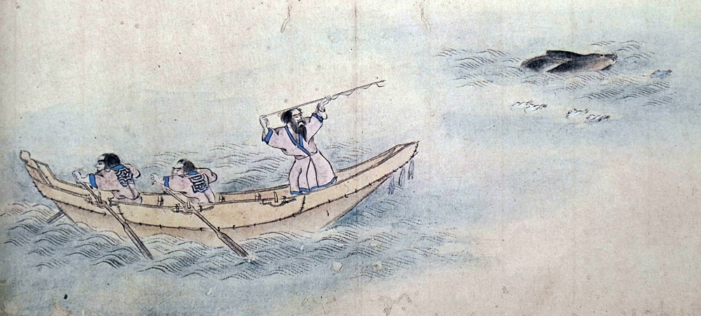 屈強(くつきよふ)の男夷壹艘に三人宛乗組、大(よふ)へ出、櫓櫂をやめ、煙草をも呑(ま)ず至て静にして海面を守り居。