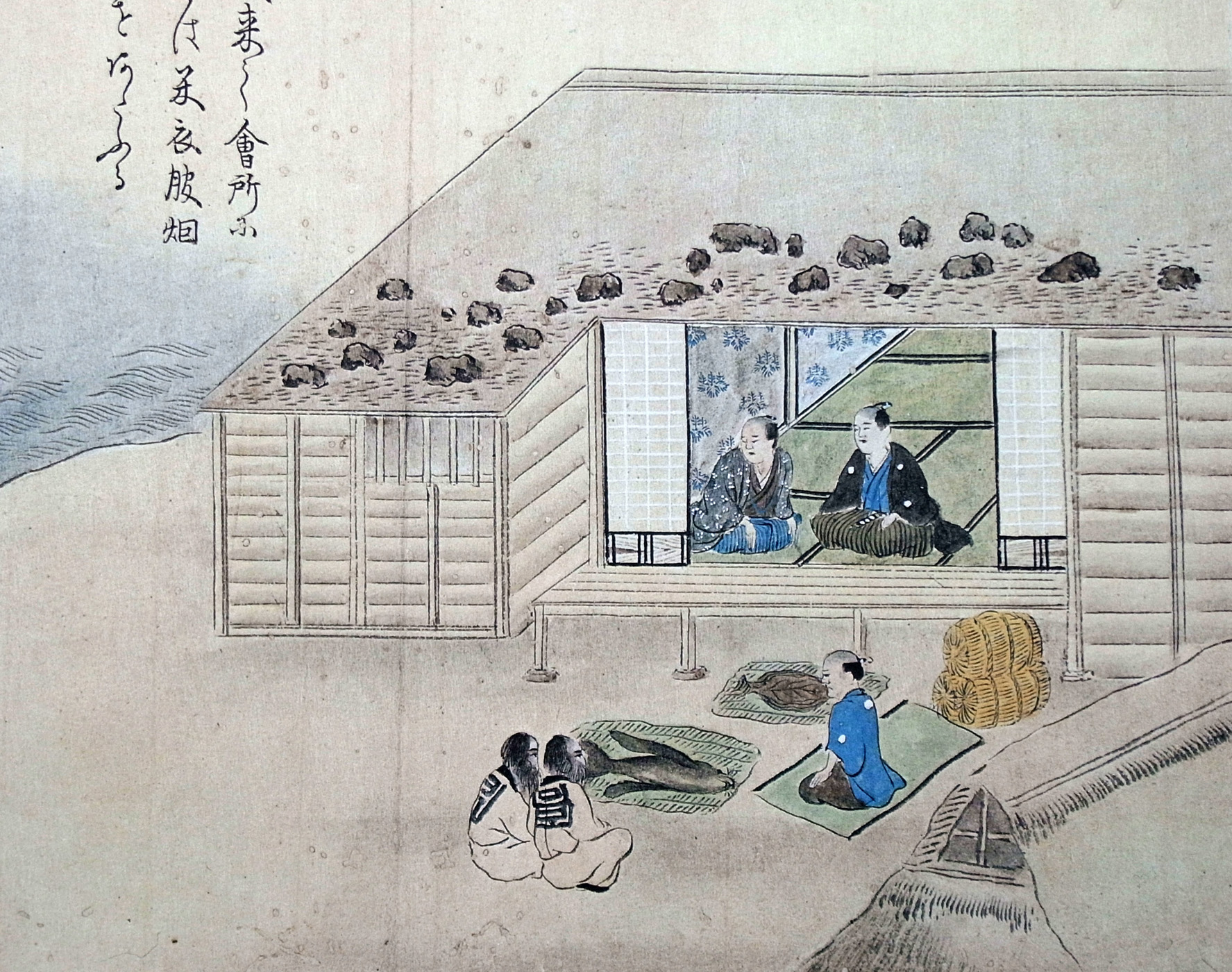 「 獲来て會所に出せは、米,衣服,烟草をあたふる。」