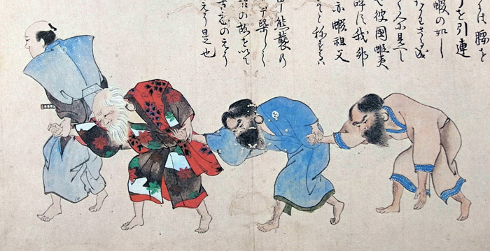 松前家ではこれを知ると、通詞を出して迎えさせ、酋長以下は礼装し、貴人を訪れる時にするように互に手をつなぎ、一列になって、通詞に導かれ藩主の前に出る。