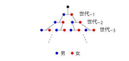 「100億人口の地球が,10万個必要」という数である。 はて,どうなっているのか? 答えは,「<父・母>溯行図の個体には,重複がある」である。 この重複が,先祖溯行したときの<先祖数の爆発的増加>を相殺している。 ──つぎは,最も簡単/極端な場合 (2個体集団の近親配偶):