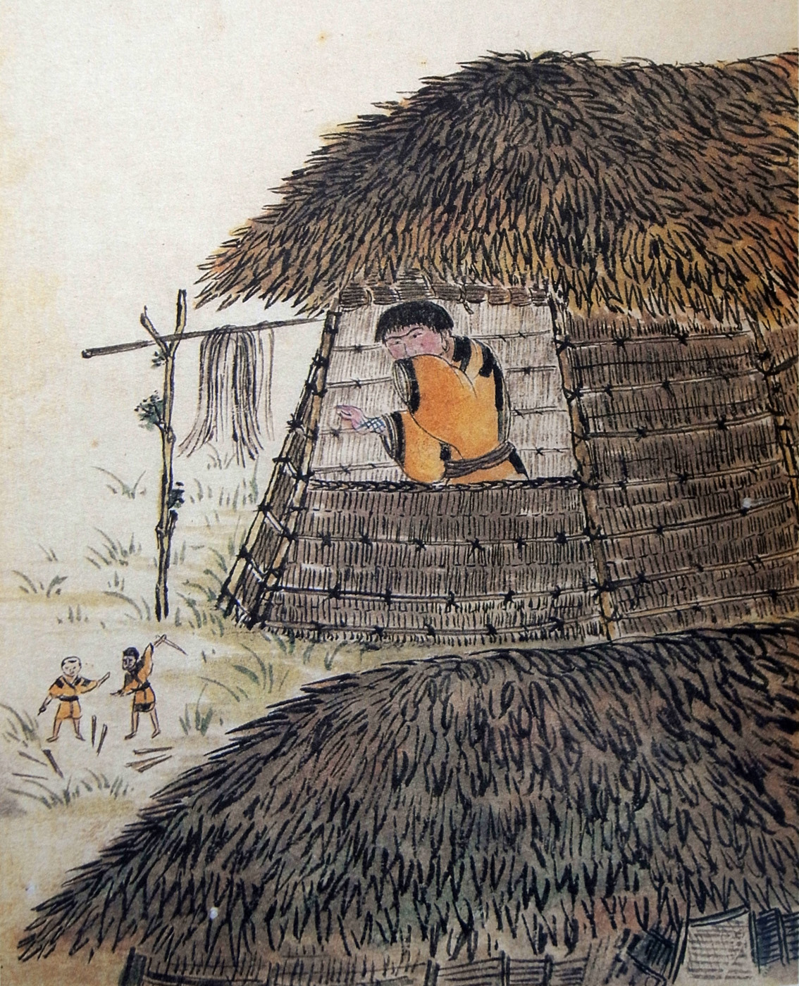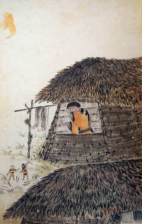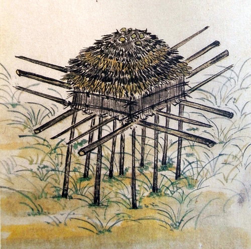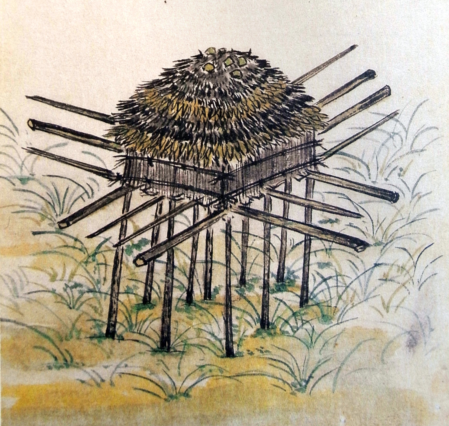 それらが軒のあたりに庫といひ、シャモ辞に多加久良 (高庫) といふ、間遠に柱つきたて、棚のやうに横木をならべて、そのうへにかや、小笹などふきかさねたる、ちいさき屋をつくりあげて、粟、稗、たら、にしん、さけなどのほじしをも、こめおくとなん。