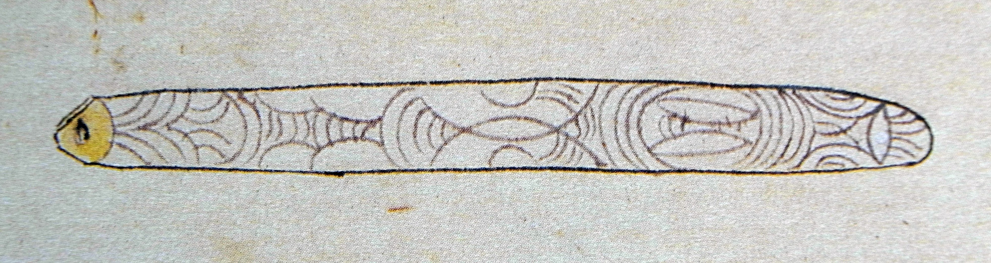 カモカモとて弦桶ゃうのものさしいだして酒こひはたり、提にうつし、ふたりうちむかひ居て、盞は台ながら左に把り、のせたる鬚上を右にとり,もろもろの神鬼をとなへつつ、かのイクハシウのうれして、そのみき露斗、いく度もこぼしこぼし捧ることひさしくて、鬚おしわけ、こゝろよげにのみて、此ひとつきのにごれる酒を、価なき宝にも、あにまさらめやとおもふならし、ゆめ、さかなもなう、さしかはして時うづりぬ。