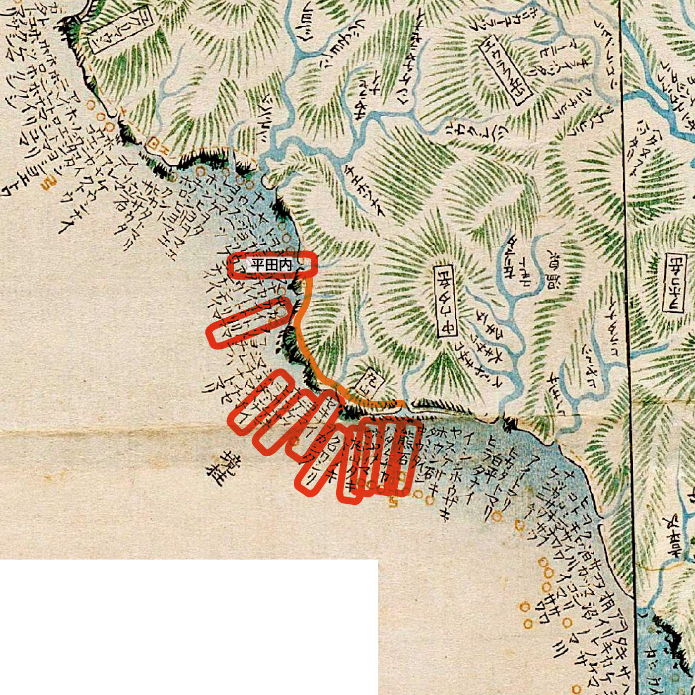 まづ寄木宇多、カイドロマ(貝取澗)、イシカイドロマ、キシノワシリ、チラチラ、あなま、ニビシナヰ,ふやげま、たきのま、タンネヒラ、ポンナイ、でけま、セキナヰ(関内)、くろワシリ、まるやま(丸山)、ビンノマ(便澗)、ポロモヰ、はたけなか(畑中)、熊石(久遠郡大成村より爾志郡熊石町熊石までの海岩集落)