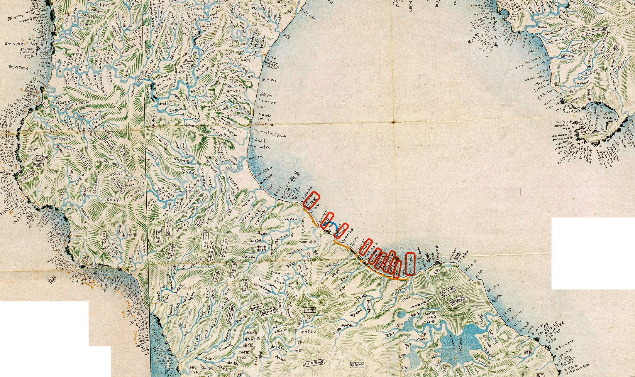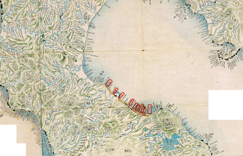 天註──此嶋ののりとて、罪をかしあるものは軽重をばかり、しもとうちして、つきあざとてぬかに入墨をしてはなちぬ。かゝるものら、あるはこと人、男女、卯辰の飢饉のとき蝦夷にいたりて命たすけられて、そこに住つき、女は夷の妻となり、男は聟(むこ)となりつるなどあり。是うら人、シャモかへりといふ。そのつみ人などのたぐひならんを、あらはにいはで、あやしとのみいふはうべなり〕