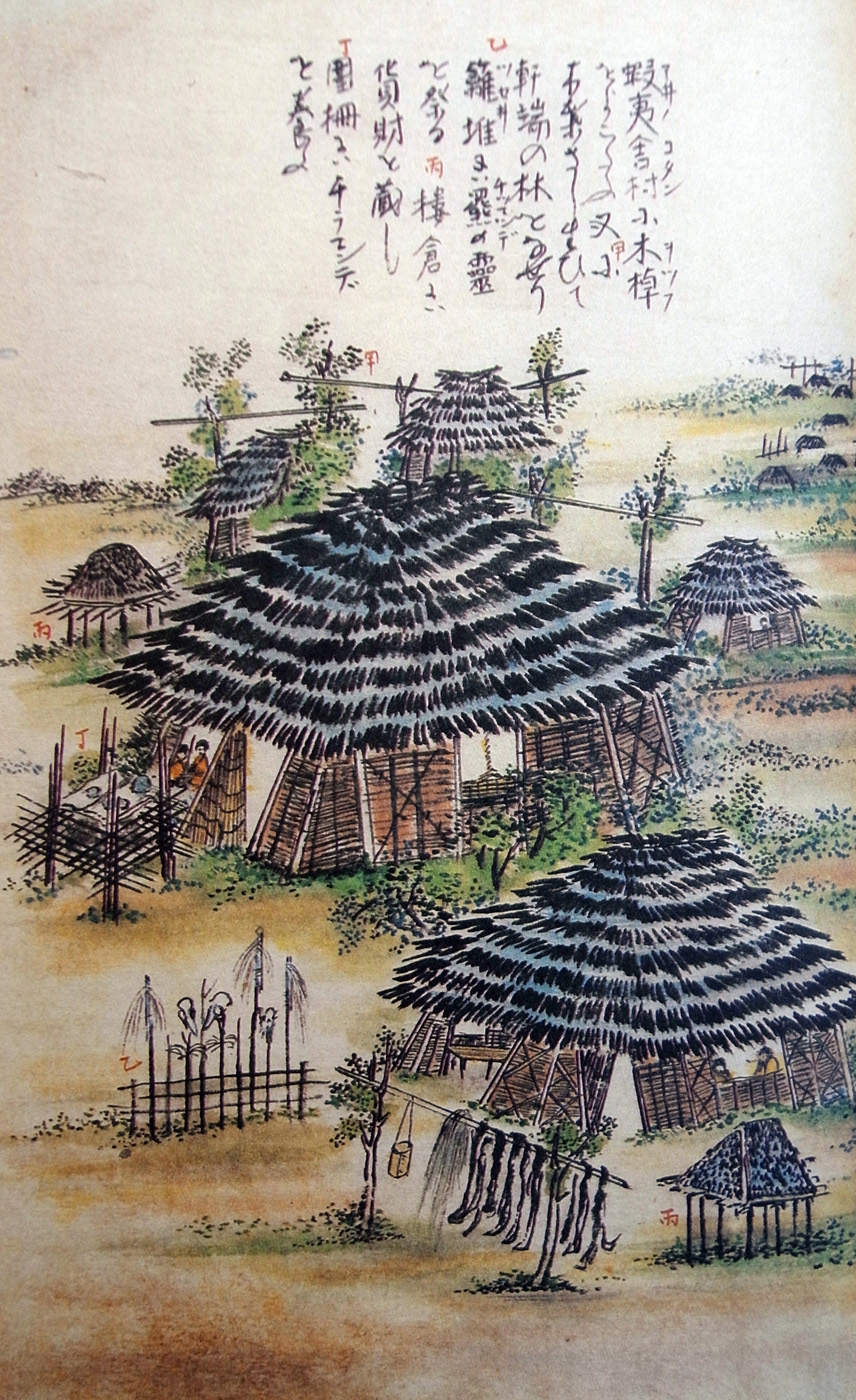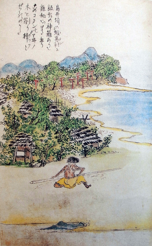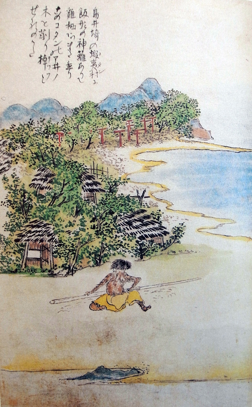 海べたにかたぬきたるアヰノの、毛は蓑着たらんがごとくむくむくと生ひたるが、オツプとて木の棹を、ピルガネとて真鉋(マガチ)もてこれを削り、錐子おし立て真砂の上に居るは、アヰノのたくみにや。