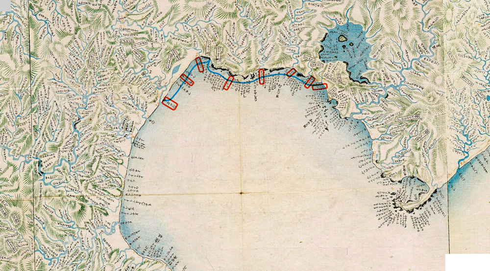 蝦夷の栖家は八十斗もありといふが、浜辺、あるは林の中にも見えて、やゝ日もくれはつる空の、くもりもなう、波の千里もしづかに、いとおもしろきゆふべ也。
