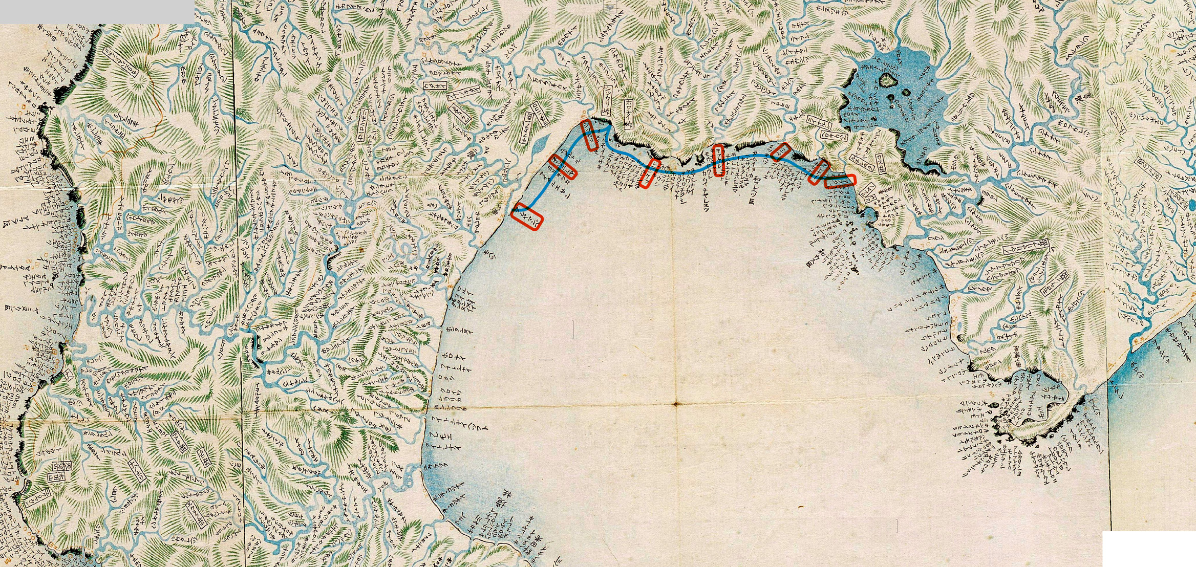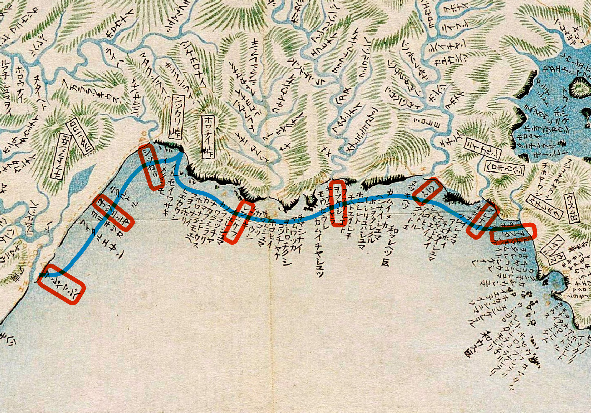 ヲフケシベのコタンをへて、へンぺのコタン、フウレナヰのコタンの、アヰノのやかたやかたを見やり行ば、寄木拾ふメノコあまた、遠う、こゝかしこに群れば、れいの途方沙浜ツヰマ、ヲ夕、集人メノコウヰノリ、リリヤンゲ、許多ホロノヲウカヰ、樵木チクニ、採コlエキとうち戯れ、のどやかにアブタ(虻田町)のコタンにつきたり。
