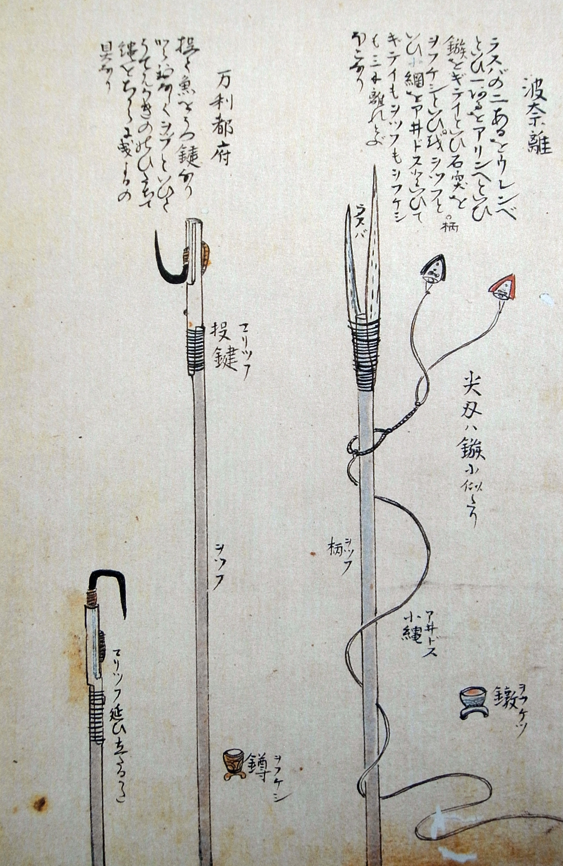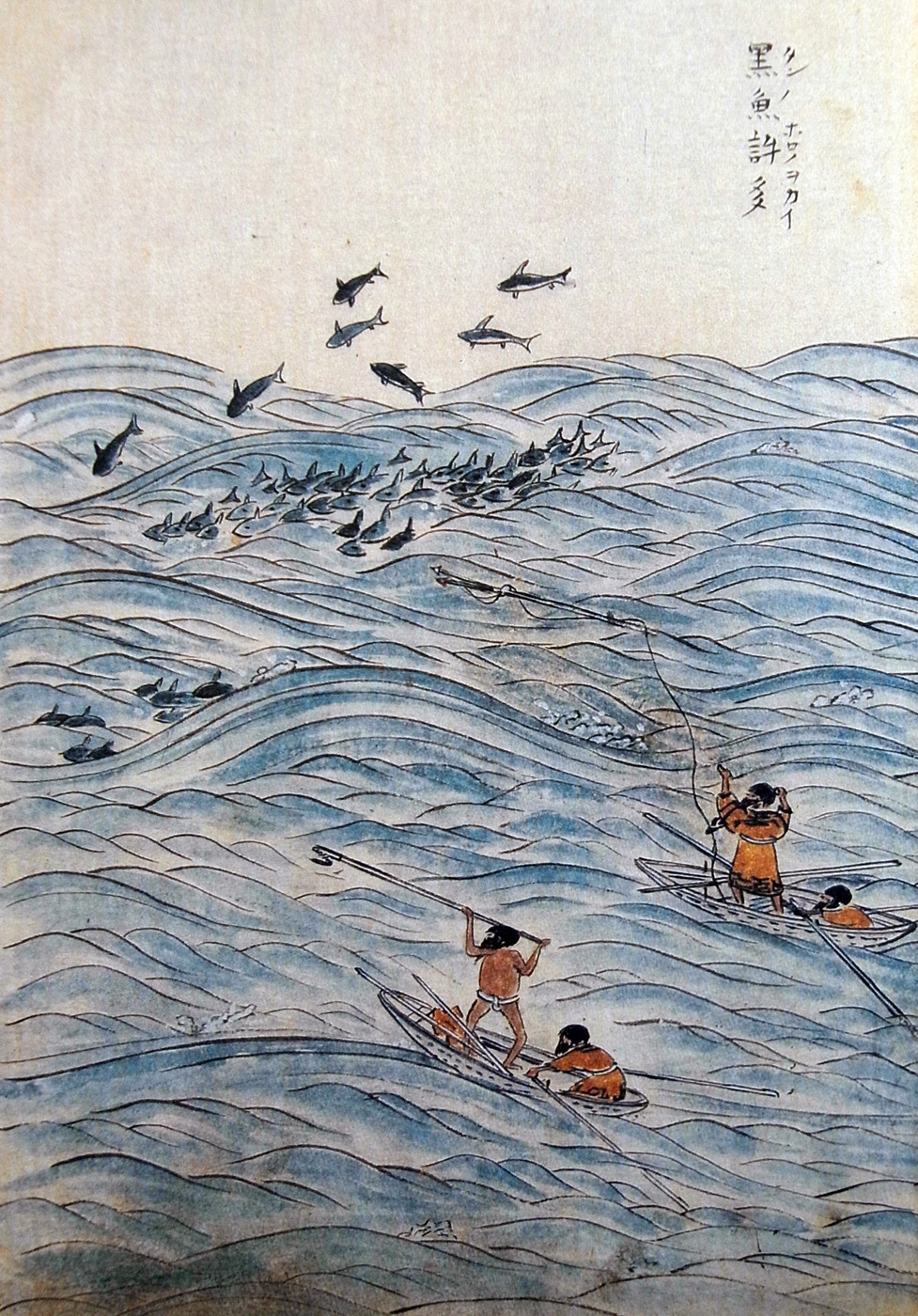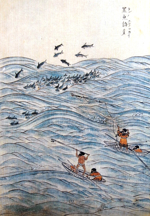 舟のアヰノら葛筥のなかより、おほふゝきの葉につゝみたる鱒魚,ブヰなど取出して、ひたにくひて、ニヤトスの水ひたのみにのみカンヂとらで休らふほどに、こゝらの黒魚(いるか)、沖もせに群れ行が行あらそひ、波を離れて五六尺斗も飛あがるを見て、ハナリ撃てんとアリンベ (一本銛) にギテヰ(銛頭)てふものをさし、アヰドスとて細き縄をギテヰに付て、柄もひとつにとりもて、ぬかにこれをさしかざし、たちねらふにおぢて浪のそこにしづみかくろふを見て、あなねたしとて船追ふ。