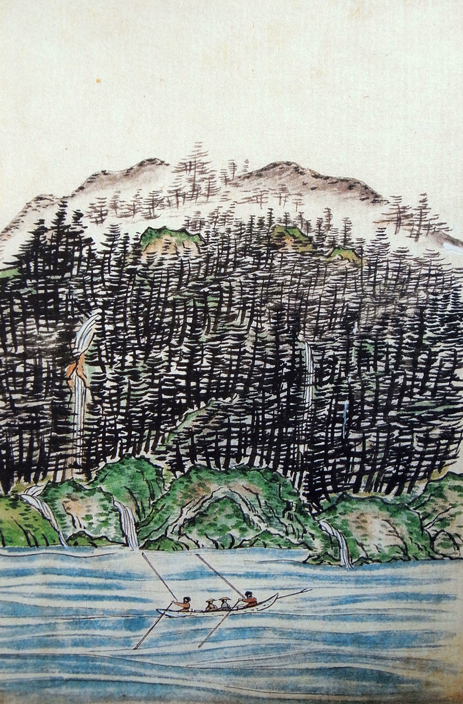 やがてこゝを搒出れば、巌の姿ことにおもしろく、蝦夷椴(トトロツフ, とどまつ)、あるは蝦夷檜木(エゾマツ)の生ひまじりたてるは、人の作りなせるがごとし。