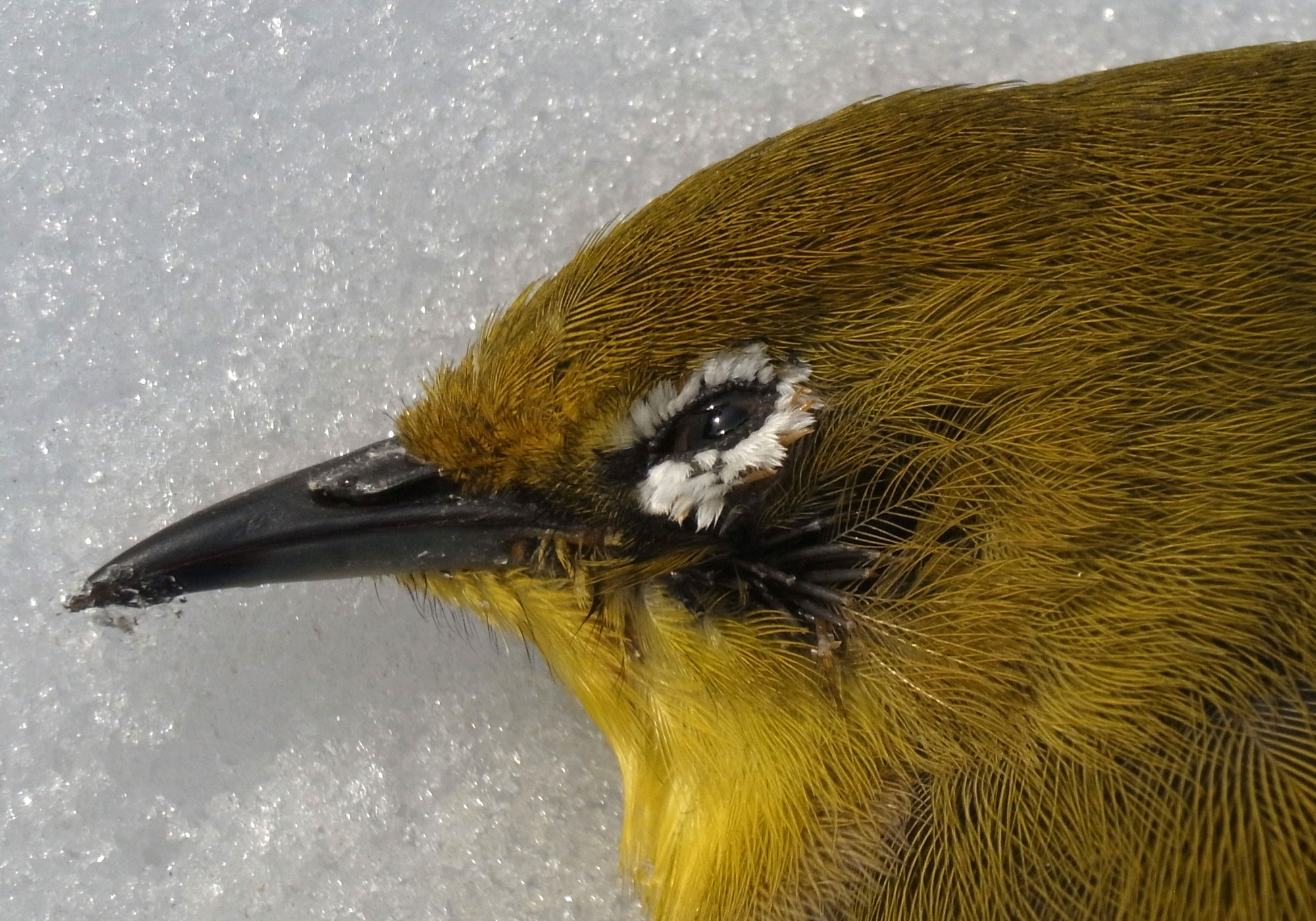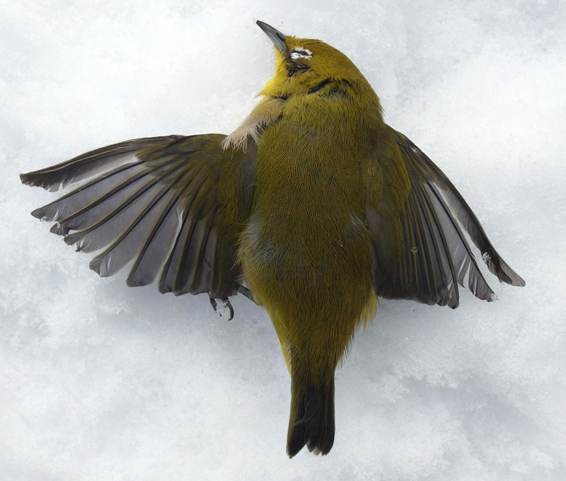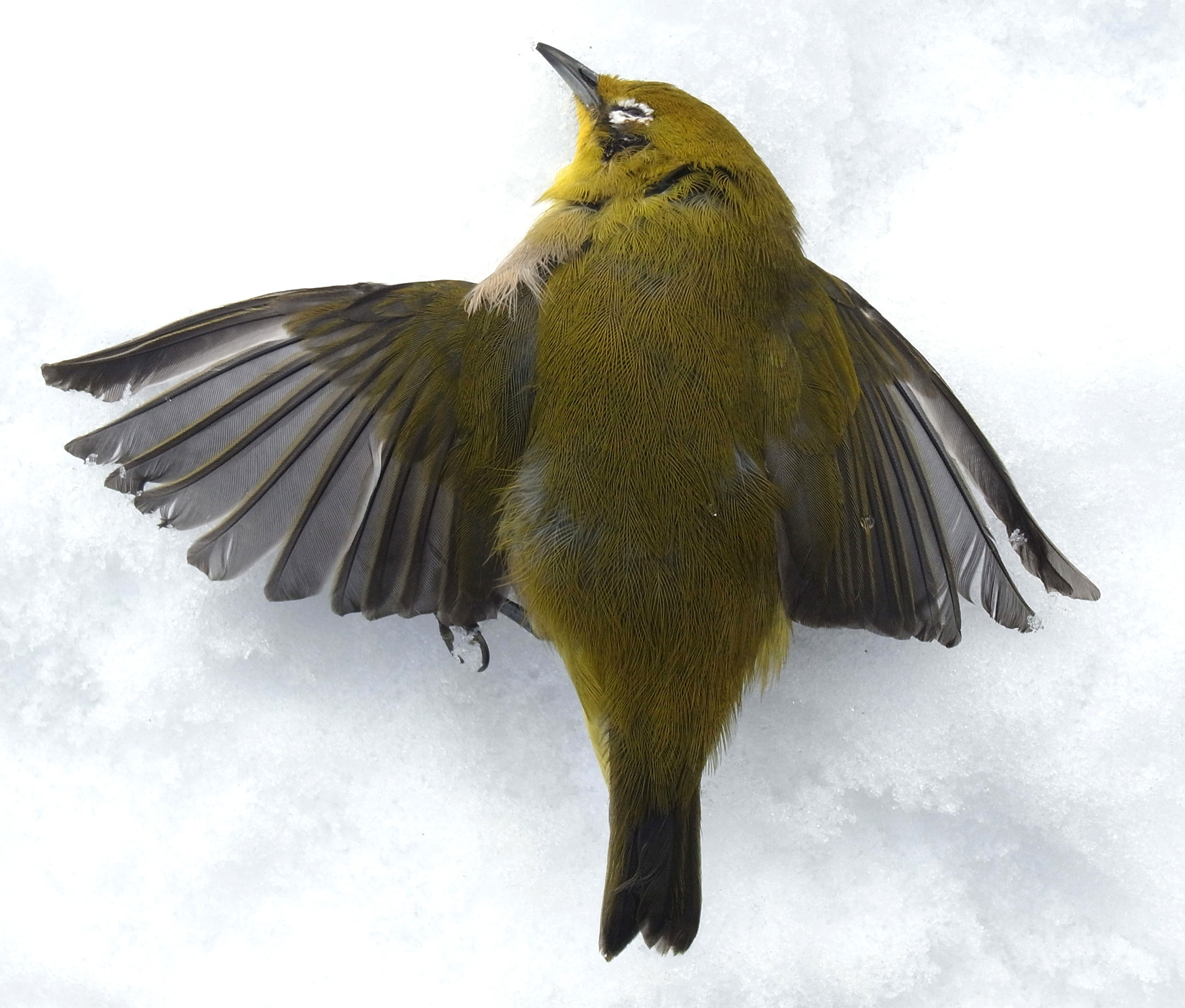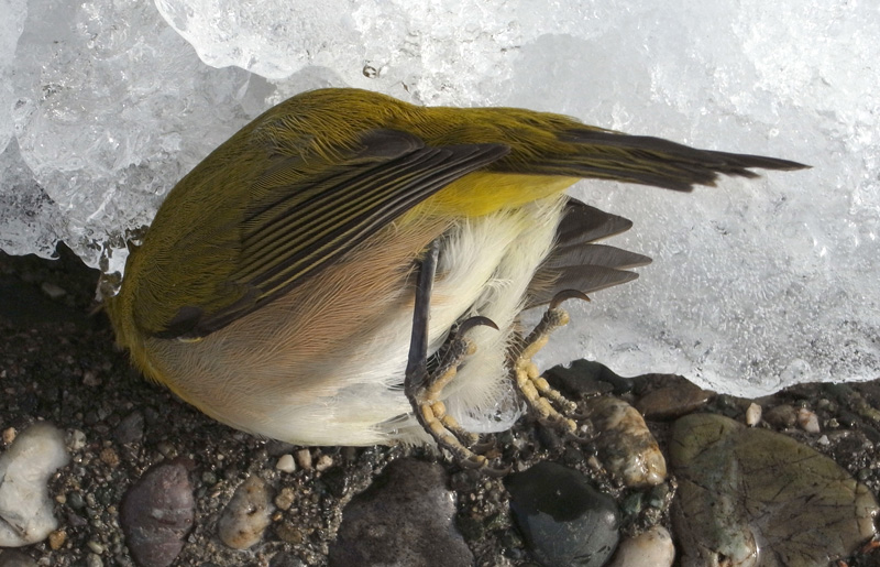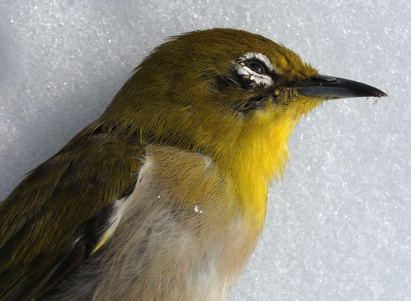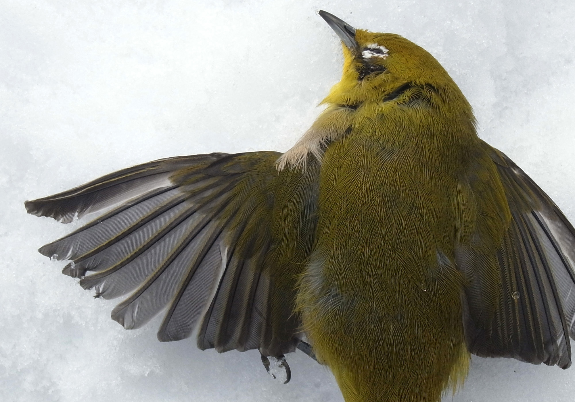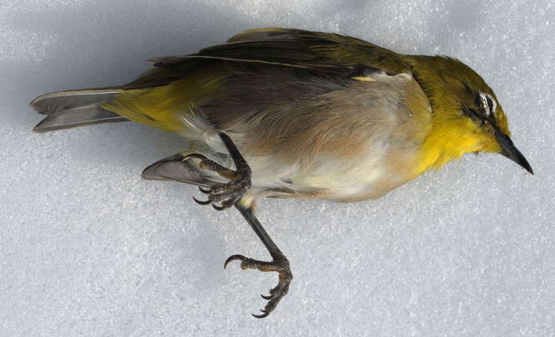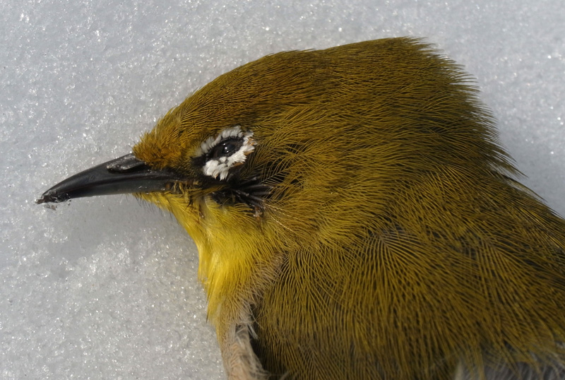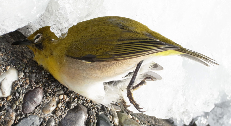 メジロが,窓にぶつかって往生。
