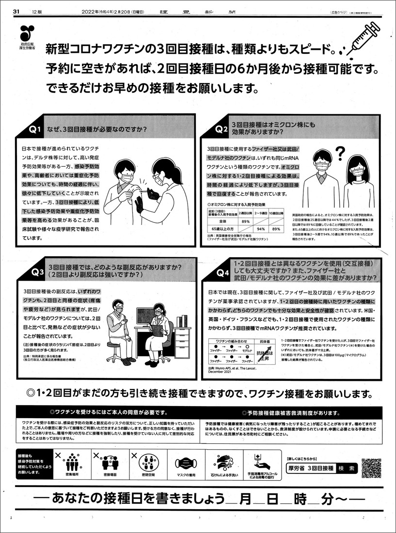 効かないワクチンを,政府が新聞に全面広告する。