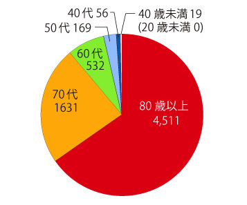 死亡には,「事故死」とそうでない死が区別される。 そうでない死は,体の機能不全死,即ち「病死」である。 病気死亡数年齢群別グラフは,上のグラフに同じと見てよい。 年間死亡数に対し「事故死」は,割合として,ごく僅かだからである。 そしてつぎは,新型コロナの年齢群別死亡数のグラフ: