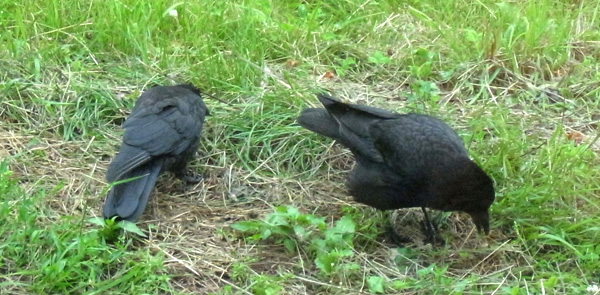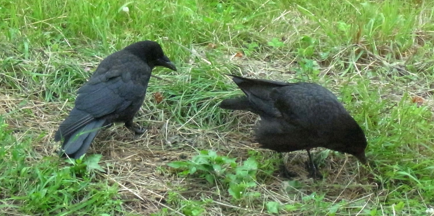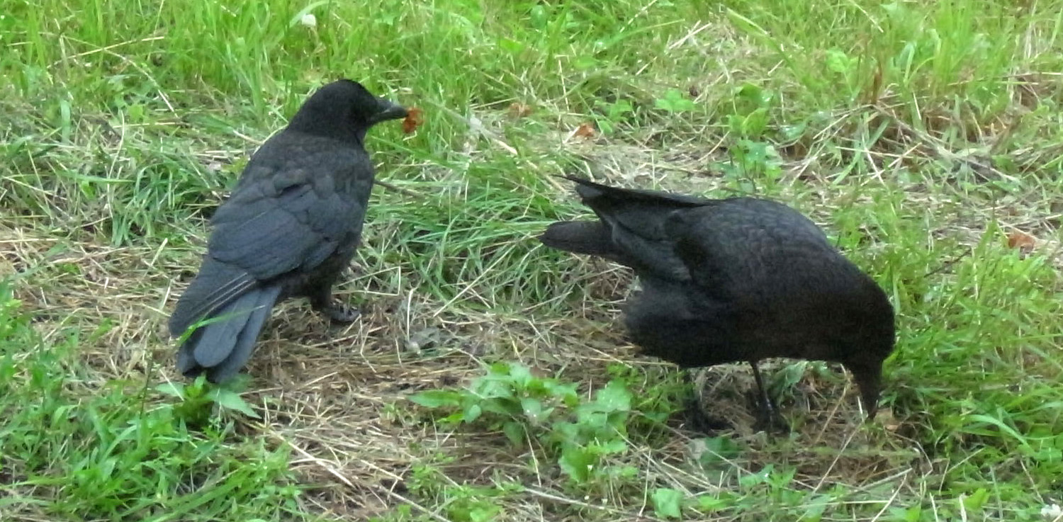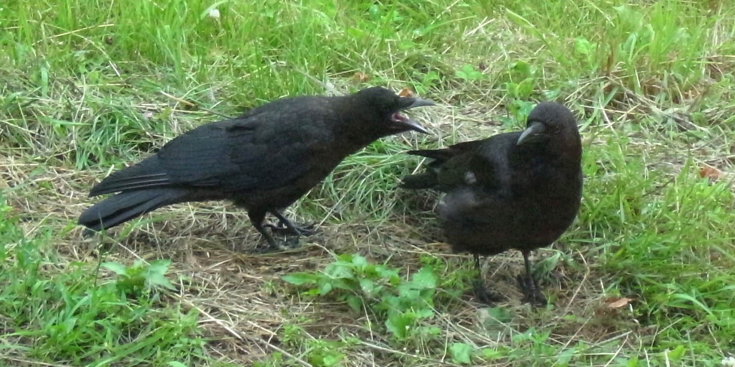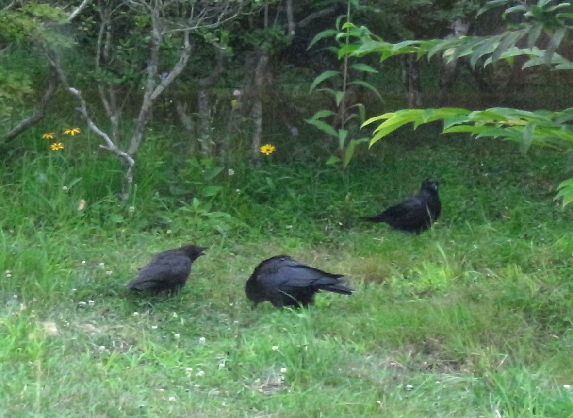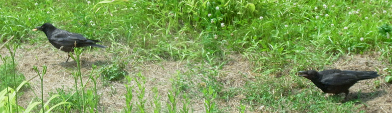 巣外育雛が7月に入ってくると,なわばりが緩くなり,隣のハシブトガラスファミリーがボソ01のなわばりにふつうに入ってくる。 この場合,両者は対峙する格好になり,また小競り合いが見られる。 そして子どもも,これにだんだんと参加していくようになる。 こういうことを含め,子どもはなわばりをもつとはどういうことかを学習していく。