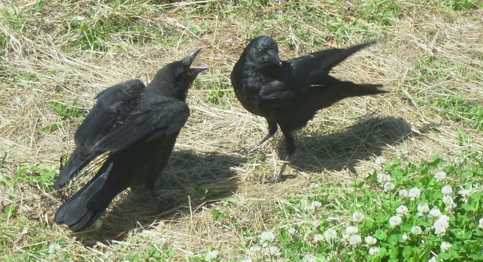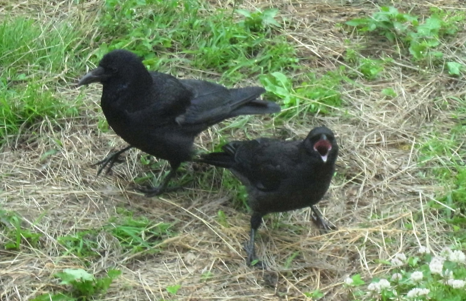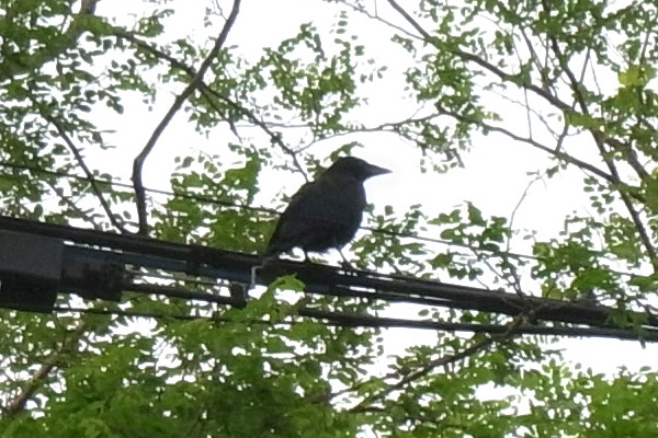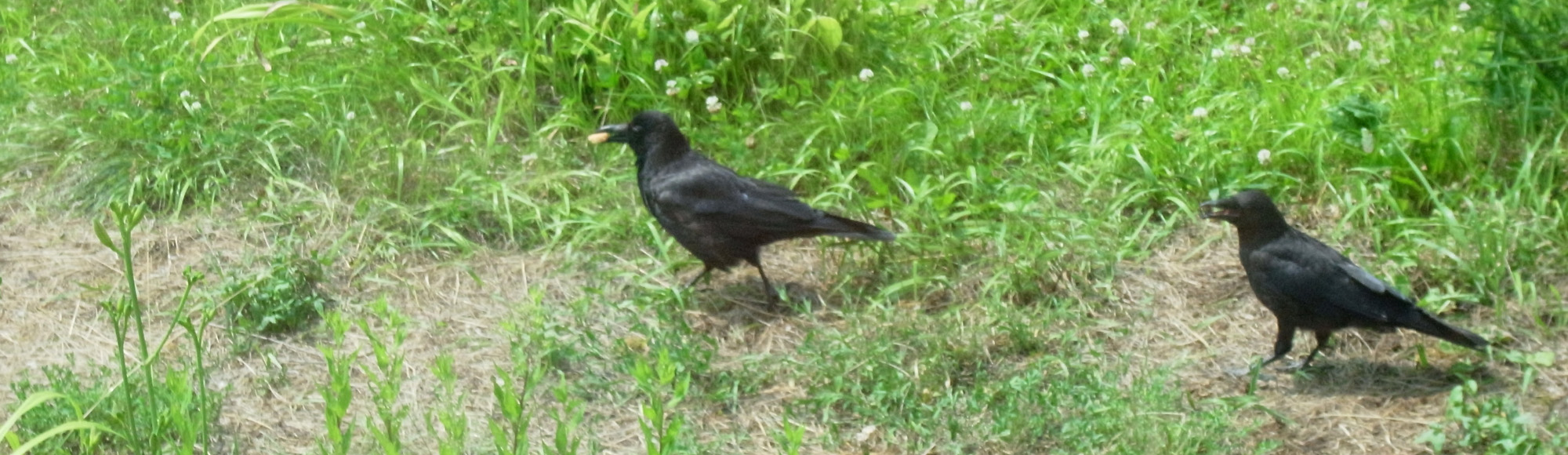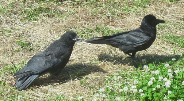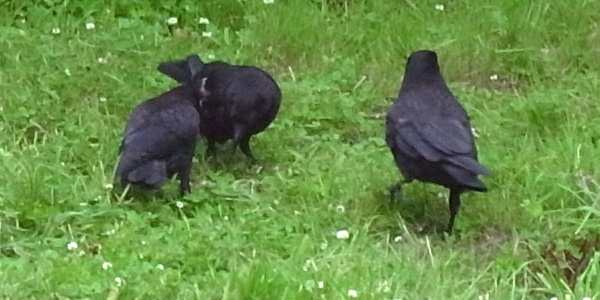巣外育雛が7月に入ってくると,なわばりが緩くなり,隣のハシブトガラスファミリーがボソ01のなわばりにふつうに入ってくる。 この場合,両者は対峙する格好になり,また小競り合いが見られる。 そして子どもも,これにだんだんと参加していくようになる。 こういうことを含め,子どもはなわばりをもつとはどういうことかを学習していく。