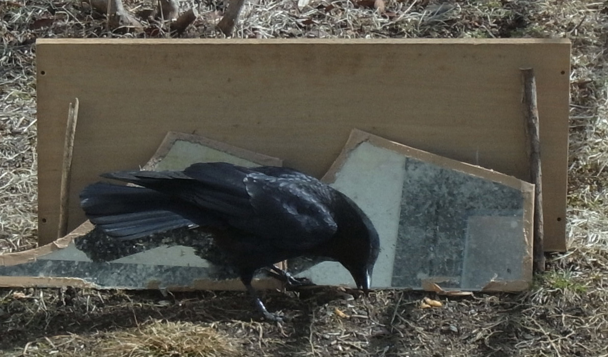 また,鏡の縁に被せたガムテープをはがそうとしたりする。 近頃の振る舞いを観察していると,鏡像を他のカラスと見ているふうはない。 また,変なものがそこにいると見ているふうもない。 ♀は,鏡を不思議なものとして,それを試しているふうである。 そこで,つぎのようにも思えてくる: 《鏡像を自分だと認識》は,学習/慣れの 実際,はじめの頃の♀の行動は,
