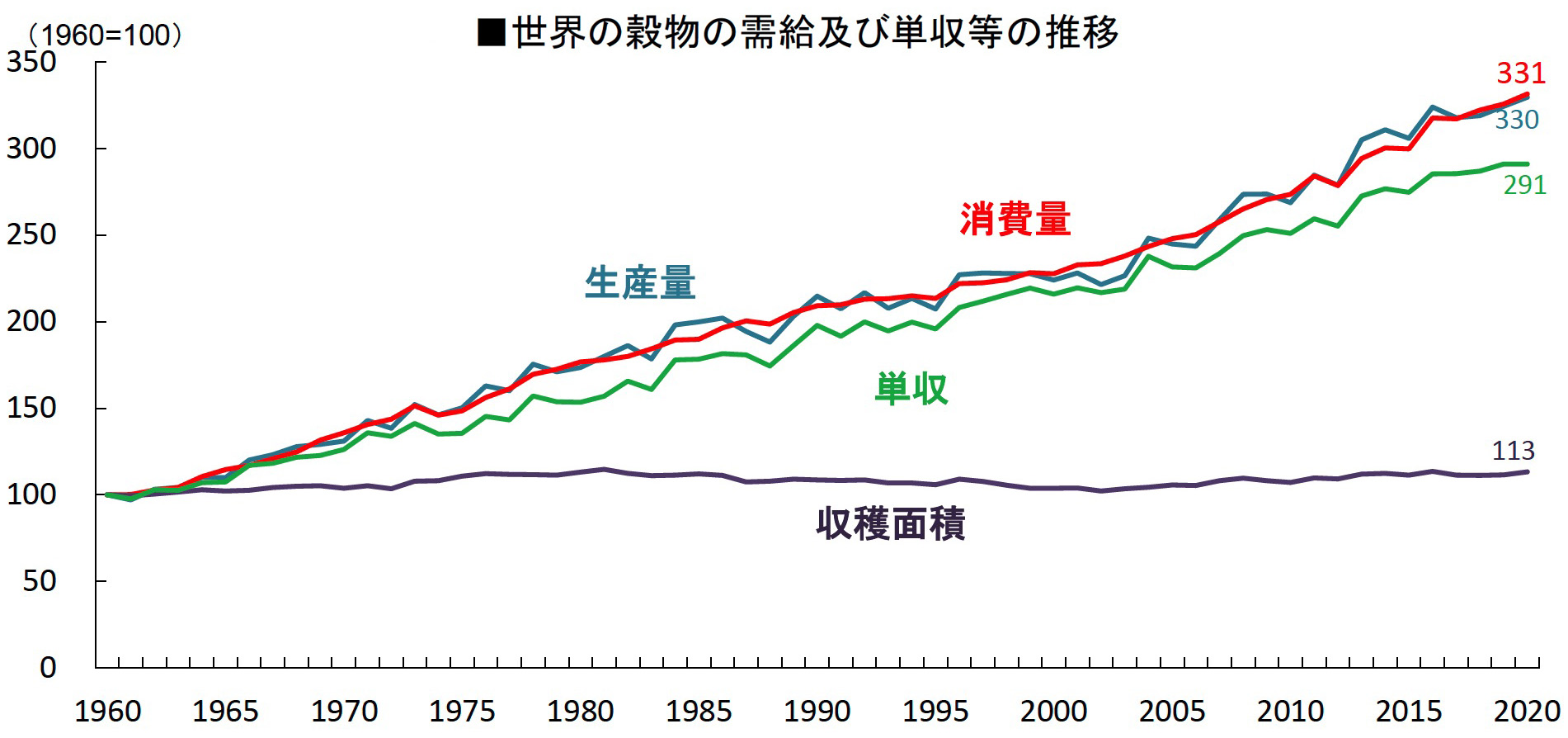生産量の<3倍以上>は,単収の<3倍近く>で実現している。 ひとは,60年間で単収が3倍になっていることを聞くと,生産技術の「改良」の賜と受け取る。 ひとにとって,増えることは良いことだからである。 何か増えることは,かわりに何かが減っていることである。 ひとは,このトレードオフに考えが及ばない。 単収が増えているのは,つぎの2つのことをやっているからである: 土壌の酷使は,土壌劣化,そして不毛化 (サバク化) へと進む。 「60年間で単収が3倍」は,土壌劣化との引き換えなのである。 そして,既にサバク化と引き換えている所もある。 では,作物の人工化の方は,どこへ進むのか? 作物の人工化が向かう先は,化学肥料だけで育つ作物である。 そして化学肥料だけで育つ作物の先に展望されてくるのが,土壌無しの水栽培である。 農業が企業化できないのは,土壌が扱いに面倒だからである。 水で済めば,農業は企業化できる。 作物の人工化とその生育環境の人口化の問題は,「それは果たして食糧なのか?」である。 ひとは口に入るものは食糧だと思う。 しかし,食糧かどうかは,体がこれをどう受けつけるかという問題なのである。 人工化を突き進む作物栽培は,腸内微生物が欲しているものを欠いている可能性がある。 そのときは,腸内生態系が壊れ,体はアレルギー症状を多発するようになる。 そしてひとは,そのアレルギー症状が何であるのかわからない。