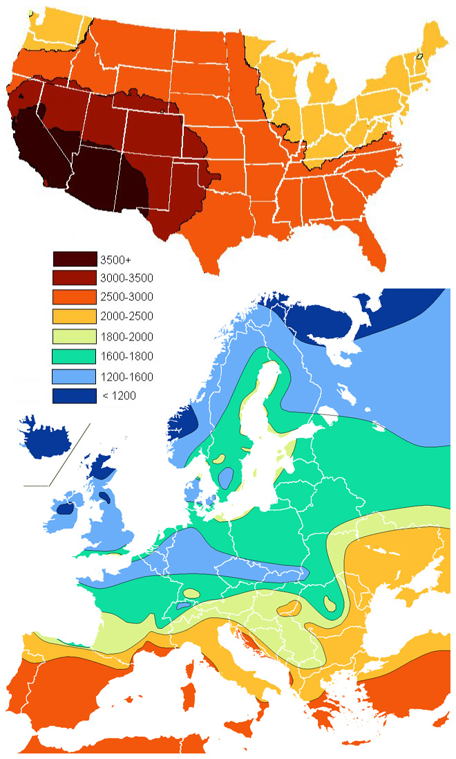 ここで,日照時間「>3500 時間」は日照率に換算すると「>80%」, ヨーロッパで最高の日照時間「2500 - 3000 時間」は「57 - 68 %」になる。