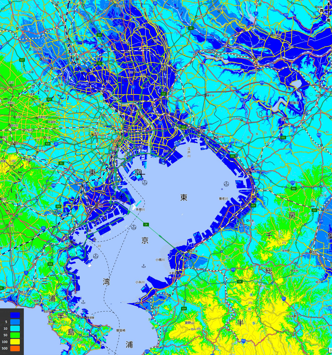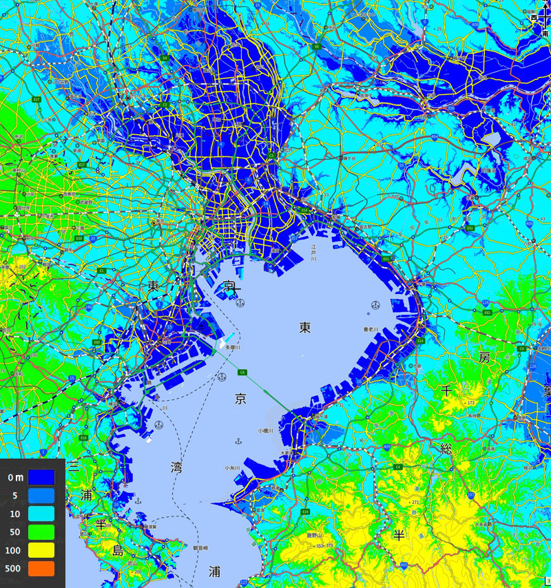 東京都は,海面すれすれの標高の土地が広く拡がる: