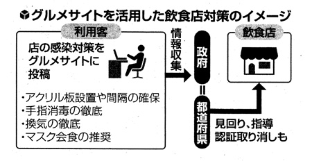 政府は月内にも、飲食店が新型コロナウイルスの感染対策をきちんと講じているか、グルメサイトを使って監視に乗り出す。