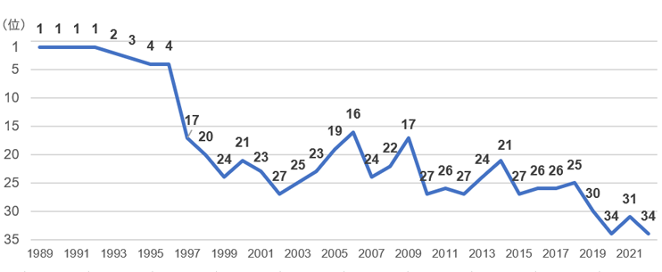 また,IMD「世界競争力年鑑」による日本の順位の推移は: