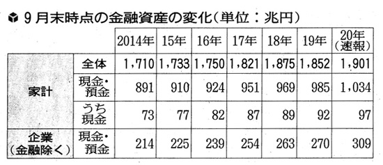日本銀行が21日発表した2020年7〜9月期の資金循環統計(速報)によると、9月末時点で個人(家計部門)が保有する「現金・預金」は前年比4.9%増の1034兆円となり、過去最高を更新した。 新型コロナウイルスの感染拡大で景気の先行きへの警戒感が広がり、個人が消費などにお金を回さず、手元に置く傾向が強まっている。