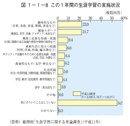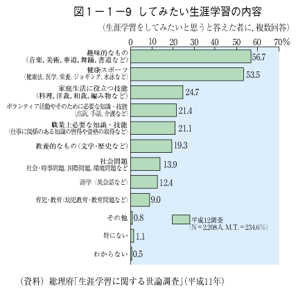 総理府「生涯学習に関する世論調査」(平成11年)によれば,この1年間の生涯学習の実施状況の中で,「趣味的なもの(音楽,美術,華道,舞踊,書道など)」は22.0%を占め( 図1-1-8),今後これらの「趣味的なもの」をしてみたいという回答は56.7%に上っています( 図1-1-9)。