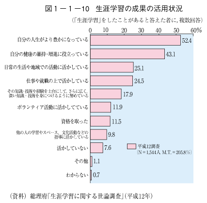 また,生涯学習の成果として,「自分の人生がより豊かになっている」という回答は,52.4%となっています( 図1-1-10)。