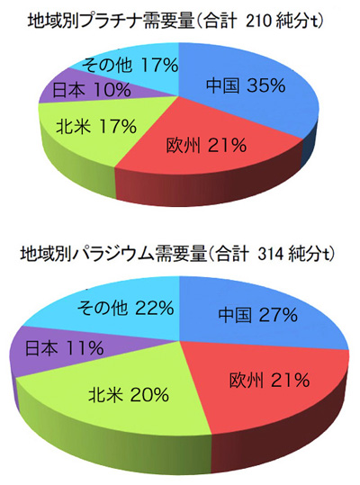 プラチナは、‥‥‥宝飾用や医療用としての用途の他に、自動車用排ガス触媒に必要不可欠な材料として広く利用されており、現在はディーゼル車用触媒に主に使用される。