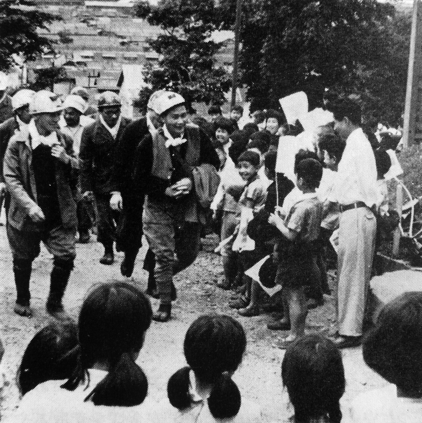 "ゴオーツ‥‥‥ウ" あたりの静けさを破ってサイレンを吹鳴らし乍ら電車にひかれた人車が勢よくホームに滑り込んで来た。 炭塵に汚れて目ばかりギョロギョロ光らした真黒い顔,どの顔も1日の務を終えた満足に輝いている顔である。 どの顔も人車より外を覗いて,停止おそしと待ちかまえている。 ガタン,ガタン 停止と同時に腕木をはずすと同時にホームにごった返し,肩と肩を打ちつけ合い乍ら,我先にとホームの降り口へと吸い込まれて行く。 進発所で見ていると帰心矢の如く脱兎の如く何か大声でやめき乍らとんで行く。 走ってはいけないと思いつゝも走りたくなるのは当然であろう。 安全灯場の係は,戦場のような忙しさだ。 新鮮な空気を腹一杯吸い込んで,今日の無事を喜ぶかのような笑顔,安全灯を返した坑内マンは,足どりも軽く楽しい吾家へ,最愛の妻子の待つ吾家へと駈け足で急ぐのである。