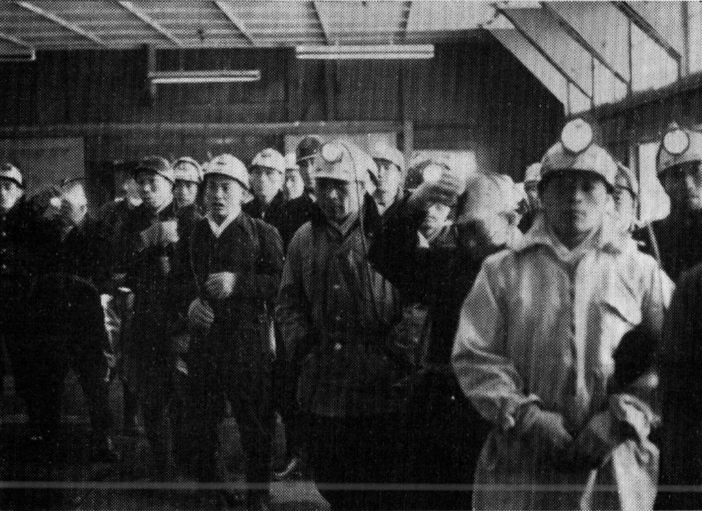 午前6時. 新鮮な朝の大きな "スコ" を背負った人や,名残り惜しそうに最後の一服を喫っている人,キリッとした現場着に身を固めた人. 寒そうに頬かむりをした人,それぞれ坑内の職場へと向かう1番方の人々が次第に集まって,繰込坂を登っていく。 軽快なレコードのメロデーがなり終って,坑内の保安状況が今日1日の安全を祈るが如くアナウンスされている。