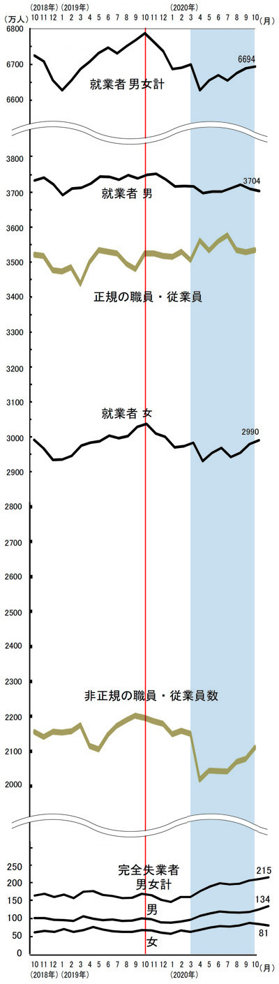 以下に,おもてに現れている就業・失業者数を示す。 就業者数は季節による変化があるので,前年同月ないし前年の推移パターンと比較すべし。 グラフは,『労働力調査(基本集計) 2020年(令和2年)10月分結果の概要』から部分引用。 就業者数,正規非正規職員・従業員数,完全失業者数の実数スケールを同じにした。 また,自粛管制開始以降を,水色で示した。 就業者約 6700 万人 は,だいたい 男 3700 + 女 3000。 一方,正規約 3500 と 非正規約 2100 を合わせて,5600。 約1100万人の就業者が,「正規・非正規」の枠の集計に乗らない類というわけである。 グラフは特に, 《解雇は先ず女性・非正規から》の傾向をはっきり示している。