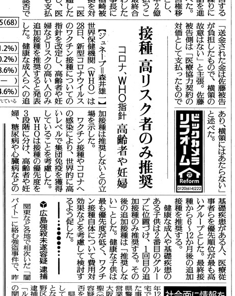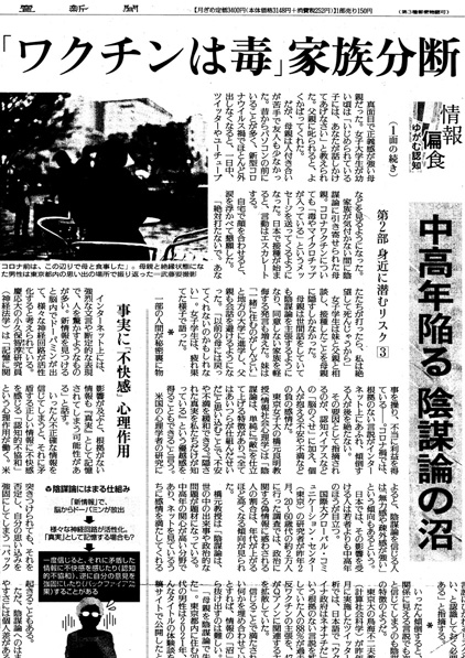 ひどく小さい扱いだが,この扱いになるのは読売新聞にとって不都合な内容だからである。 ワクチン接種は,「ワクチン禍」を生んだ。 「ワクチン禍」は,「コロナ禍」とはひとの受け取りが違ってくるところがある。 「コロナ禍」は,大衆の自業自得の面がある。 実際,コロナ禍は,メディアと大衆の共作である。 大衆はこれを意識しているので,「コロナ禍」の責任をどこかに問うということはしない。 責任を問えば,自分に返ってくるからである。 ──大衆は,各種「警察」をやってきた。 一方,「ワクチン禍」では,大衆は<指導されてワクチン接種をした者>の位置づけになる。 そして,ワクチン接種の煽動・指導には,「死ななくていい者を死なせた」の含蓄が付くことになる。 したがって「ワクチン禍」については,大衆は煽動者・指導者に責任転嫁することになる。 煽動者・指導者は,これをかわさねばならない。 煽動者・指導者は, 「実施されたワクチン接種は必要なものだった」とは言えない。 「新型コロナ」は「ただの風邪」だったからである。 ワクチンは「少なくとも若年層には無用」だったからである。 で,どのような物言いになるか。 読売新聞では,つぎのようになった: