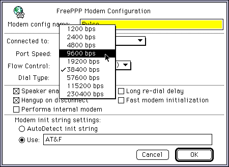 If the connection fails, try to change the modem port speed.