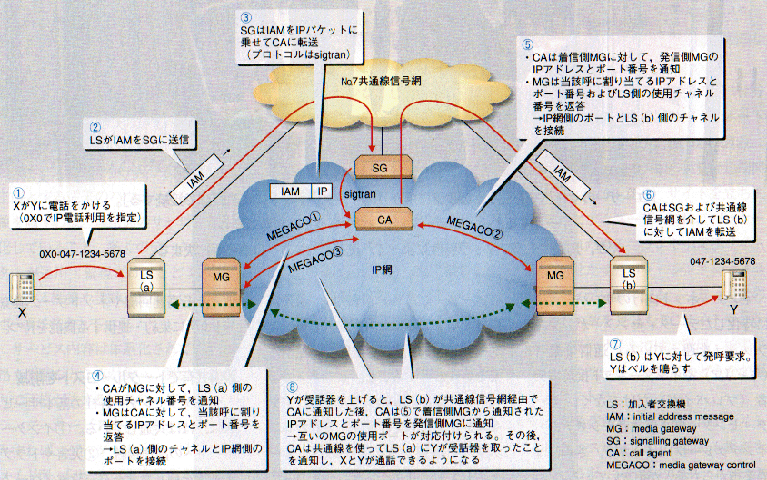 IP 網を中継網とする場合は,LS が共通線信号網を介して IAM を CA に転送する。(共通線信号網と IP 網をつなぐ SG (signalling gateway) が途中に介在)