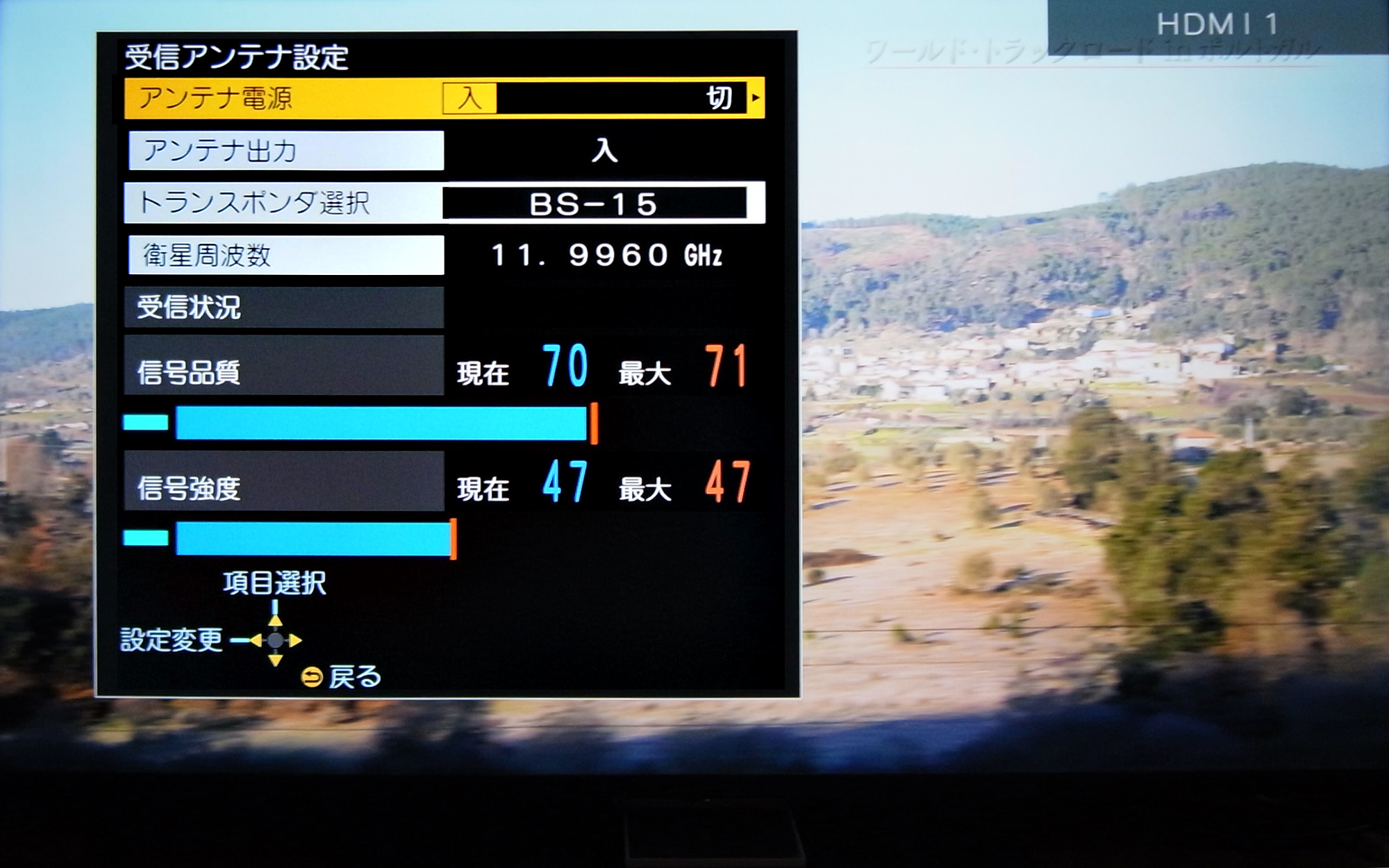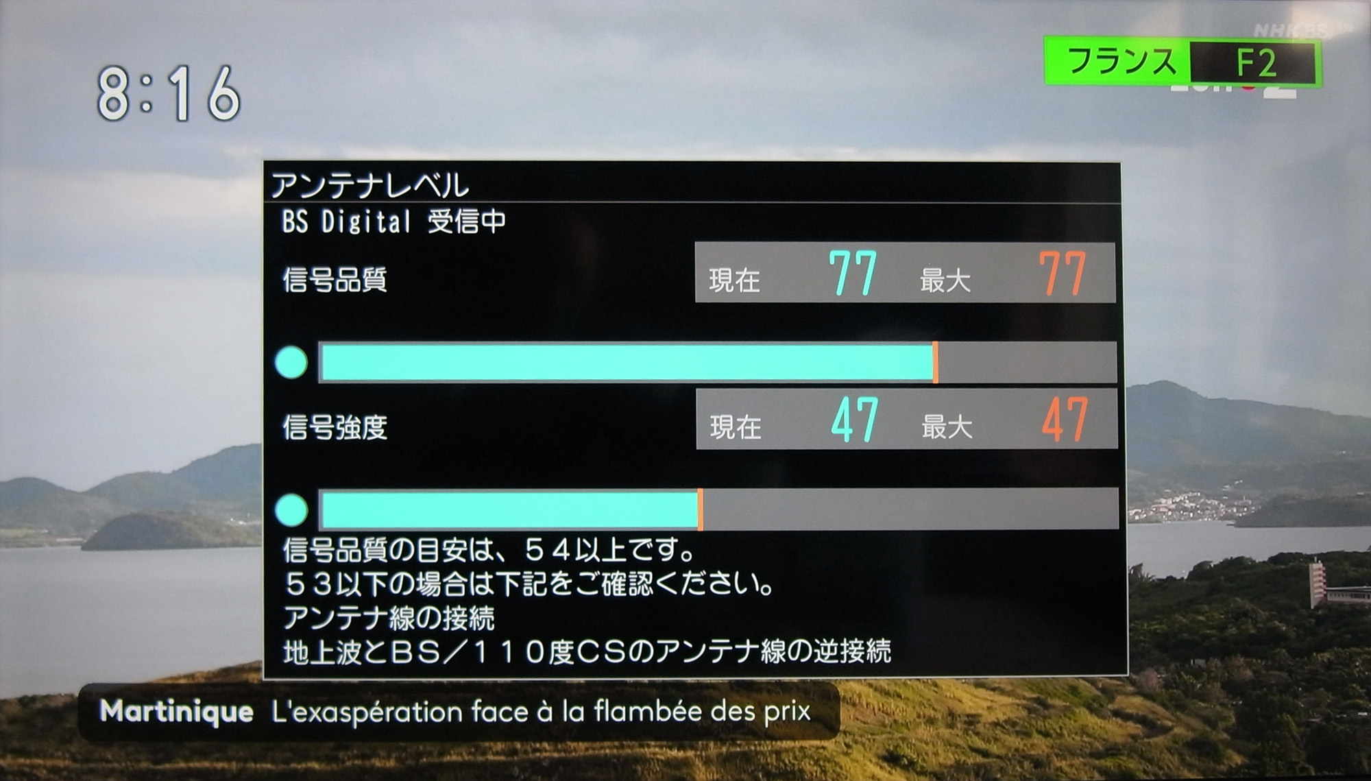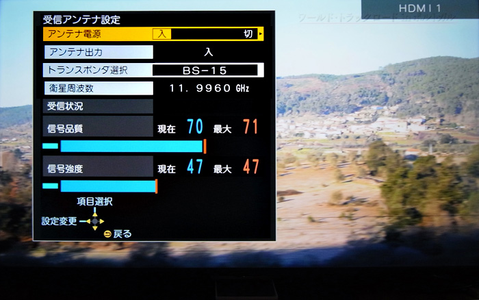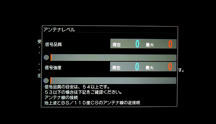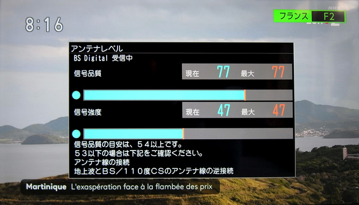 先に示したように,TV のBS受信レベルはブラックアウトの「信号品質0 信号強度 0」と回復の「信号品質77 信号強度 47」の二通りであり,その中間は無い。