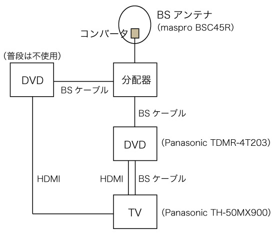DVD (TDMR-4T203) と TV を BSケーブルでつないでいるが,この接続により,BS を TV に映す方法がつぎの2通りになる: