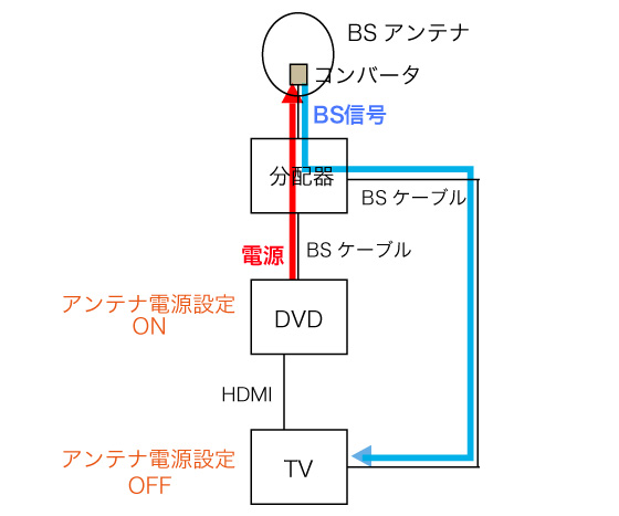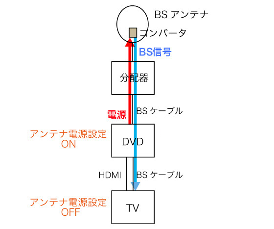 TV と DVD を BS ケーブルでつなぐとき,TV のアンテナ電源の設定は「オフ」にする。