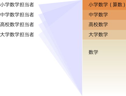 りくつの上では,算数・数学担当教員は,自分の所属する学校種をこえた学校数学を押さえている必要があります。 ──自分の直接担当の学校数学がどのような文脈にあるかを知らないで,授業できるわけがないからです。