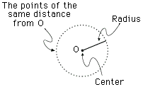 • 特に,「円」を「1点Oから等距離にある点全体」と特徴づけることができます。そしてこの特徴づけの方が,操作・生産の面で都合がよいので,これが「円」の定義に選ばれています。